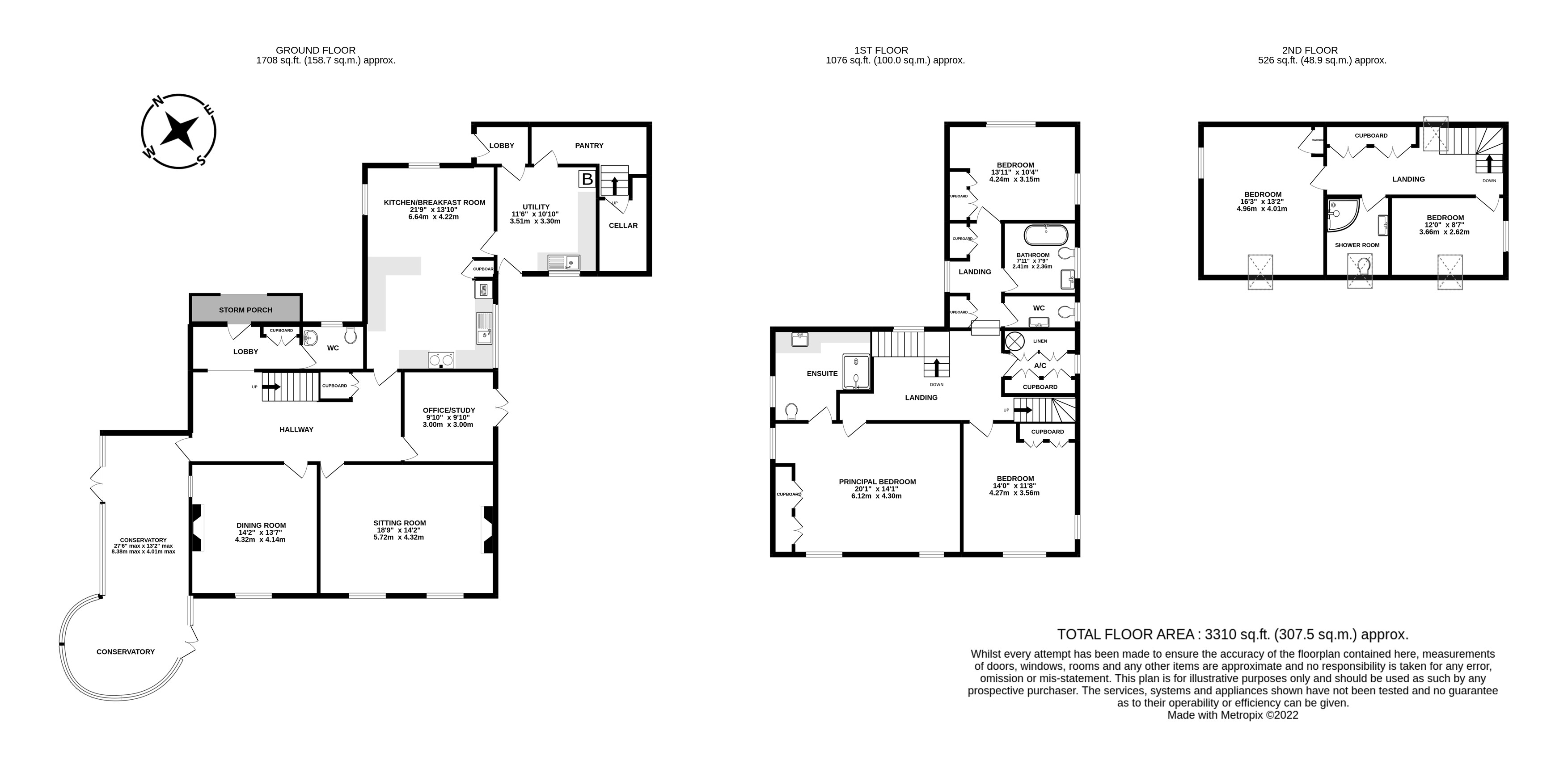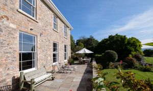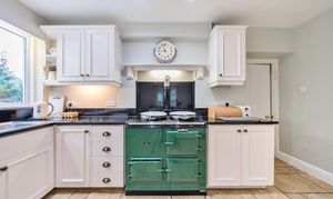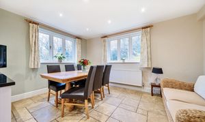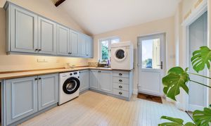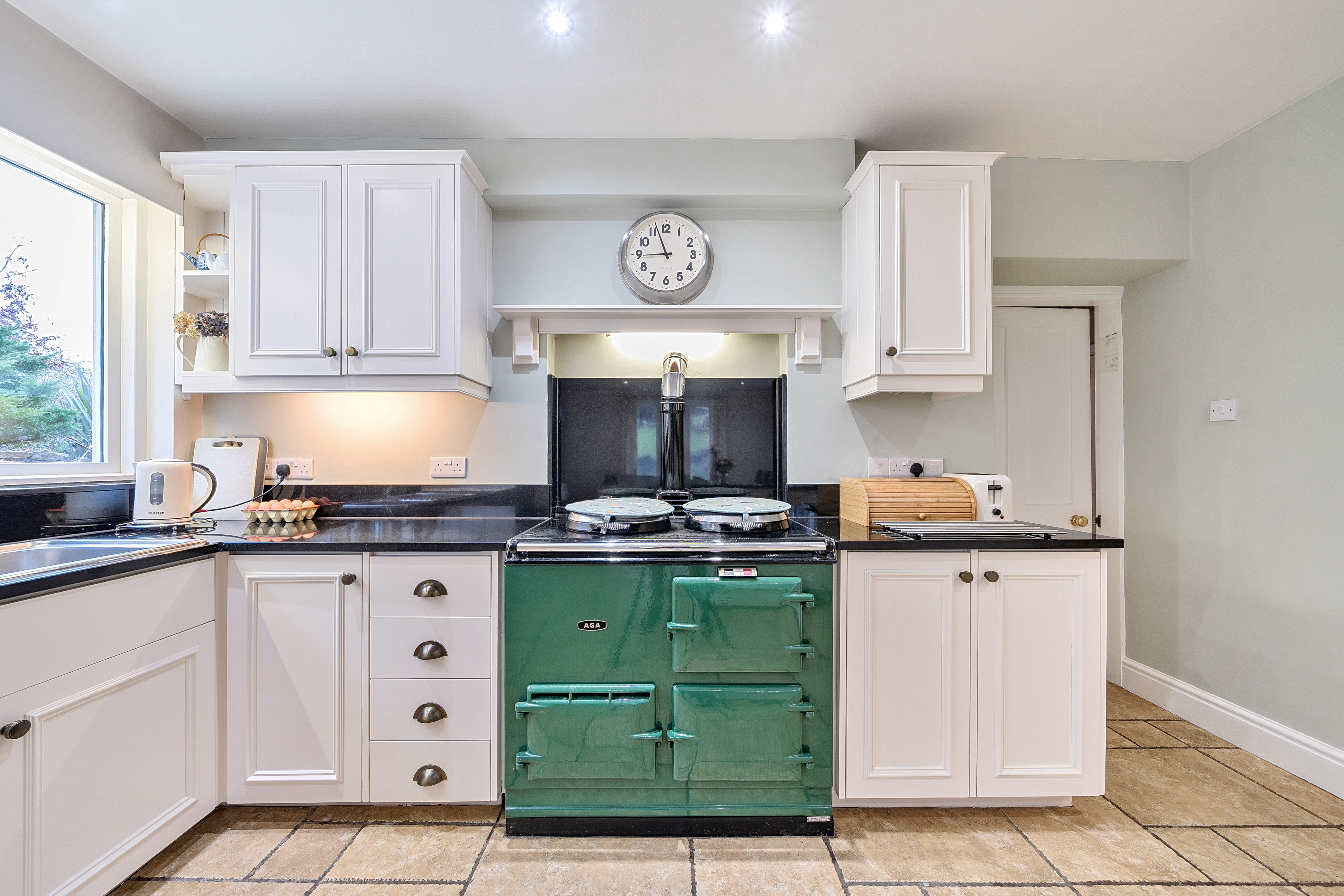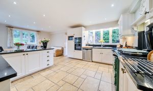 The unusually large conservatory provides direct garden access and wonderful views, and the well fitted kitchen/breakfast room incorporates a racing green Aga and an extensive range of wooden units with granite work surfaces, in addition to a Neff double oven, plus space for a large breakfast table and a sofa. Off the kitchen is a generous utility/boiler room, a boot room with direct access to the parking area, and a large pantry with steps down to the cellar, ideal for wine storage. Also on the ground floor is a smart cloak/boot room and a study with wooden floor and French doors providing access to the alfresco dining area and wide flagstone terrace running across the back of the house.