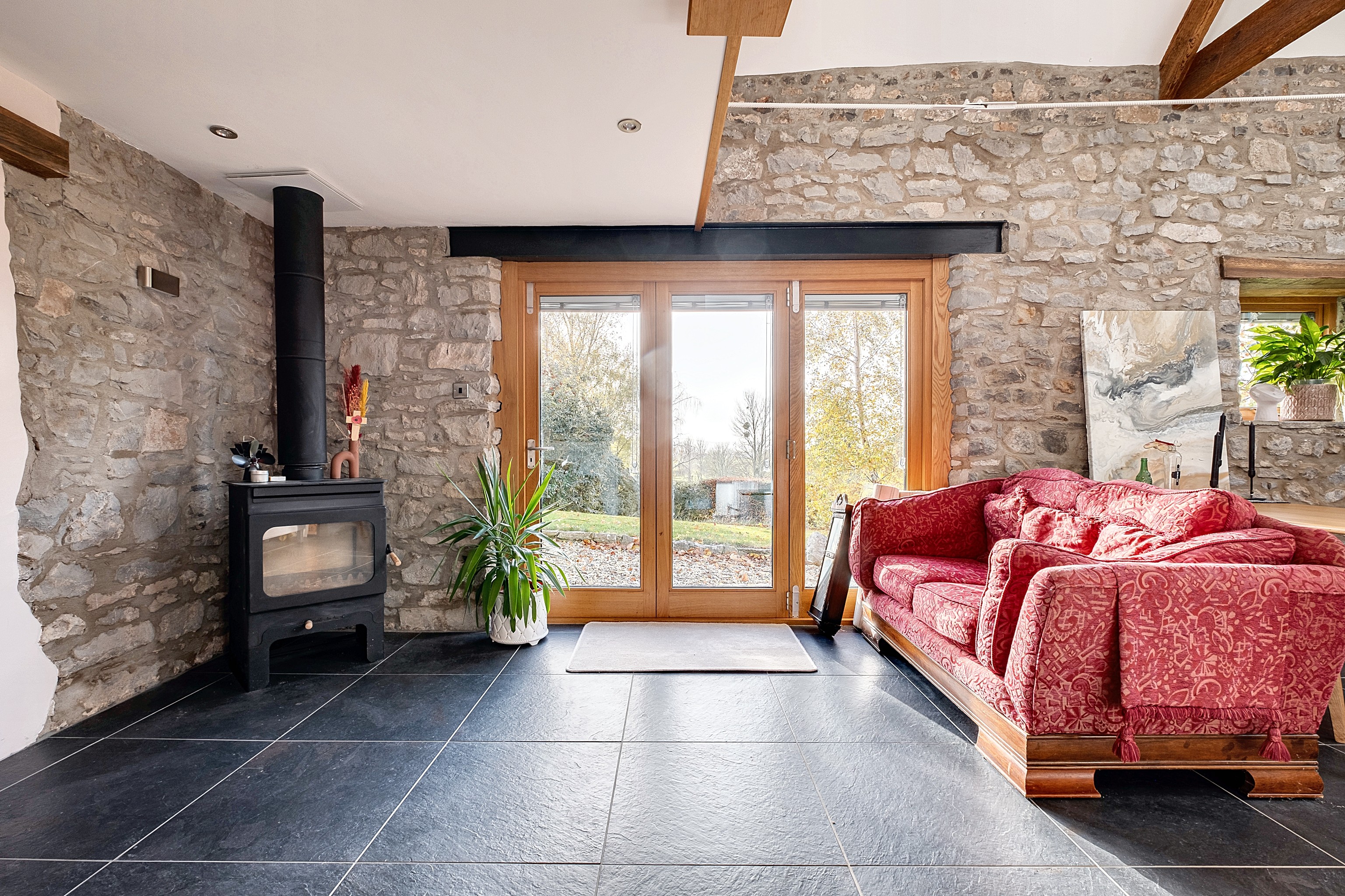 THE BARN – is a beautifully presented, recently converted detached stone walled barn, ideal for dual occupation, to provide an income source (subject to any necessary consents) or as a separate office suite for working from home. The double height sitting/dining/kitchen room with smart slate floor, wood burner and direct garden access through a glazed bi-fold door incorporates high quality fitted kitchen NEFF and Zanussi appliances including a double oven, gas hob and overhead extractor, dishwasher, fridge and freezer. Also on the ground floor is a stylish shower room and generous double bedroom with a utility/boiler room off. On the first floor is another double bedroom with exposed beams and 2 Velux windows, a smart bathroom and a contemporary glazed mezzanine office/sitting room overlooking the ground floor.