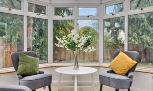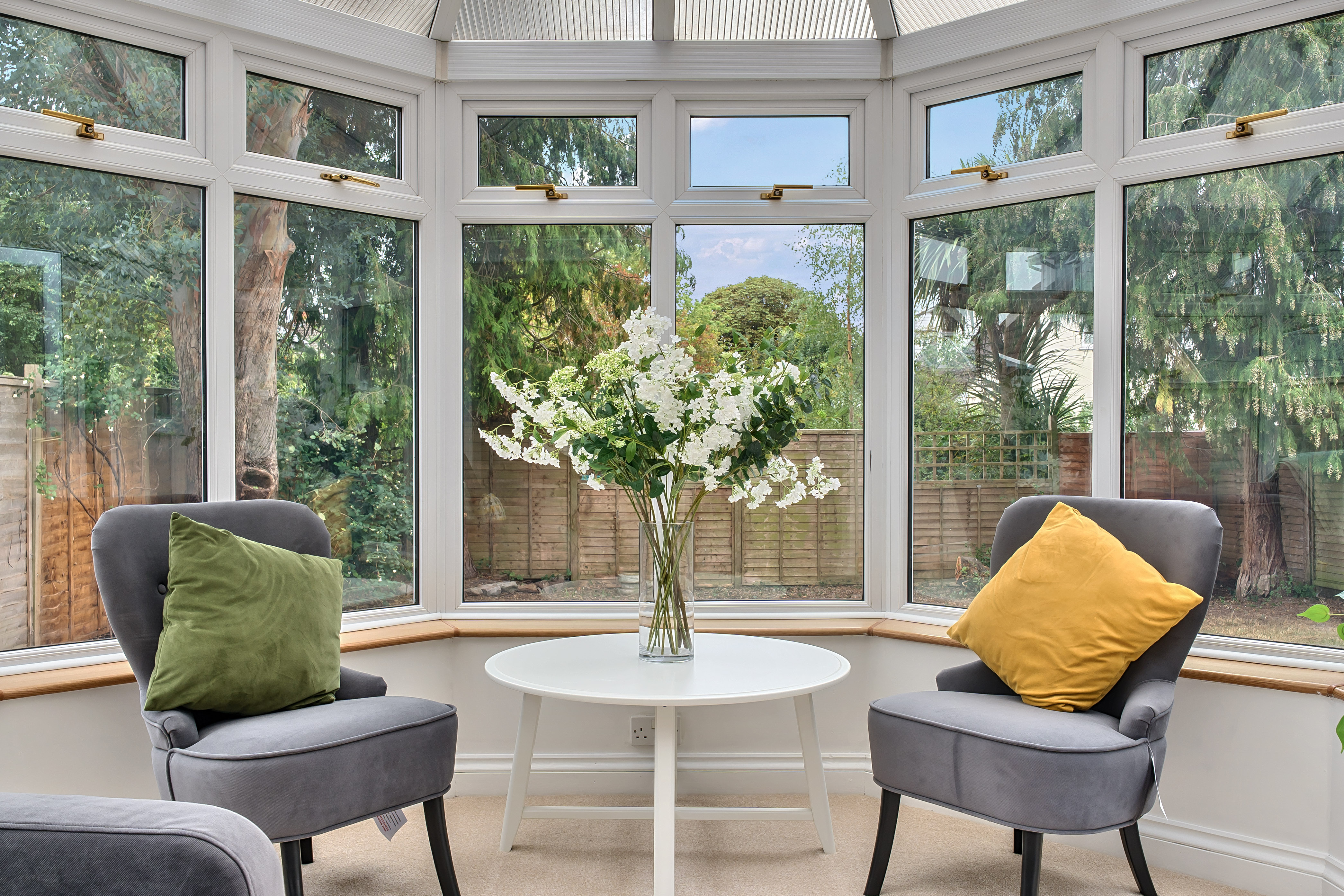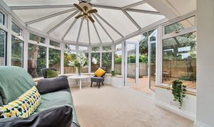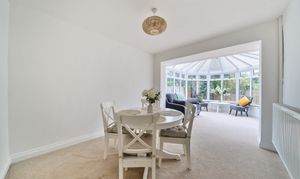To the left, the kitchen opens into a large open plan dining area which flows directly into the conservatory. This substantial, bright space is ideal for entertaining and family life, with French doors opening onto a raised decked area overlooking the garden.