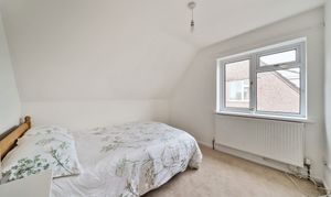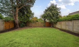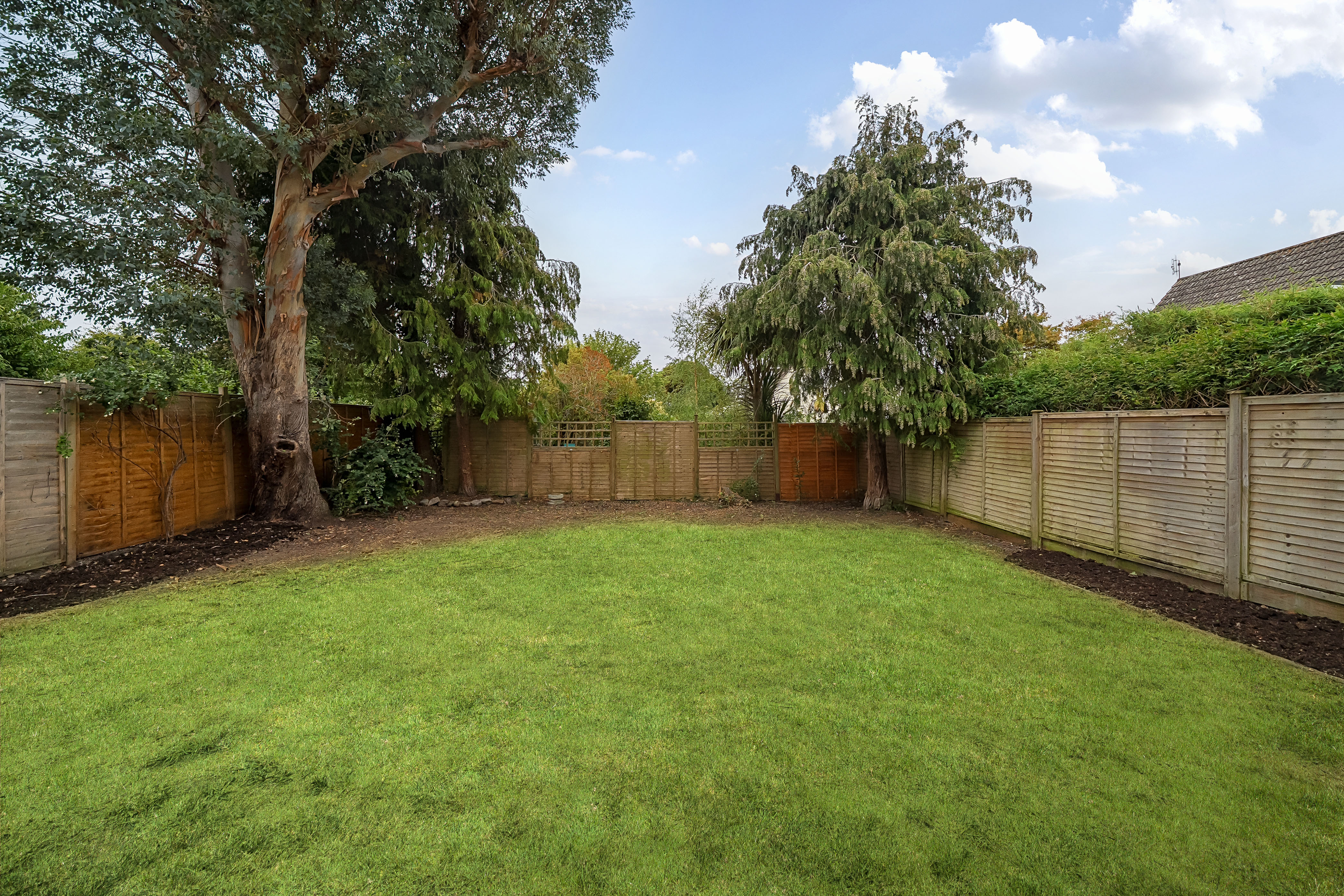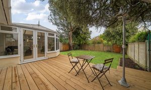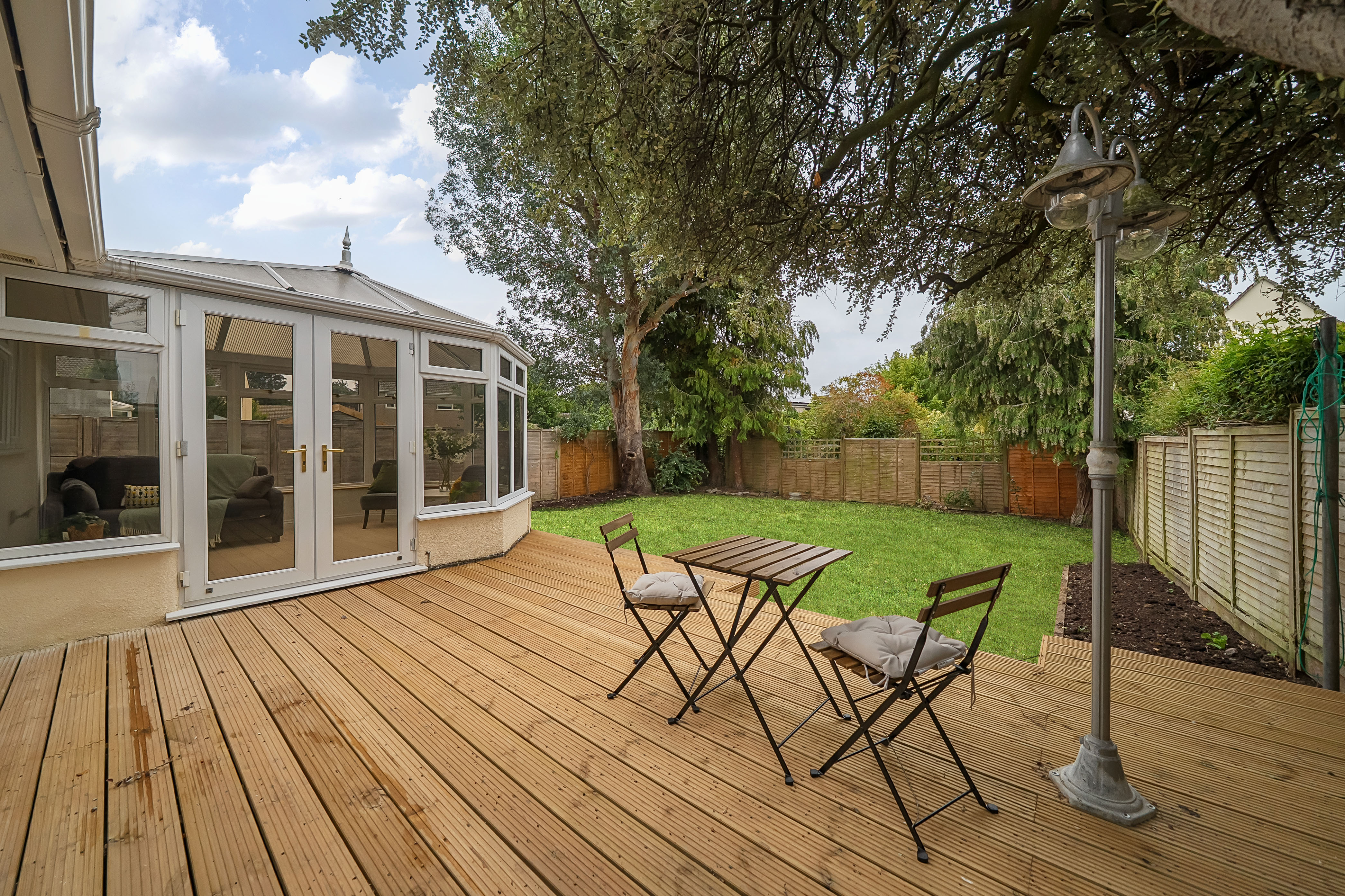 The property has a large front garden, mainly laid to lawn with established shrubs, driveway parking, and access to the garage. A wide side path provides easy access to the rear garden, ideal for bins or bikes. The south-facing rear garden is generous and very private, with a raised decked area perfect for outdoor dining, which leads down to a main lawn bordered by mature trees and ready for planting.