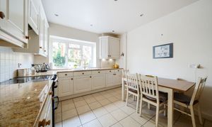 The home welcomes you through the front door into a spacious hallway with elegant stone-tiled flooring, providing ample storage for coats and shoes. The hallway leads through to a well-appointed kitchen and breakfast room on your left featuring cream wall and base units, complemented by sleek granite worktops. This space easily accommodates a dining table so is ideal for casual family meals.