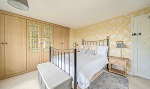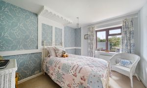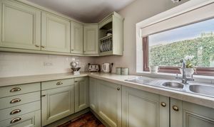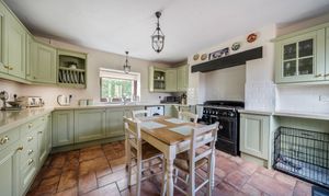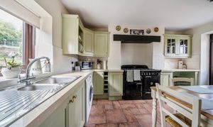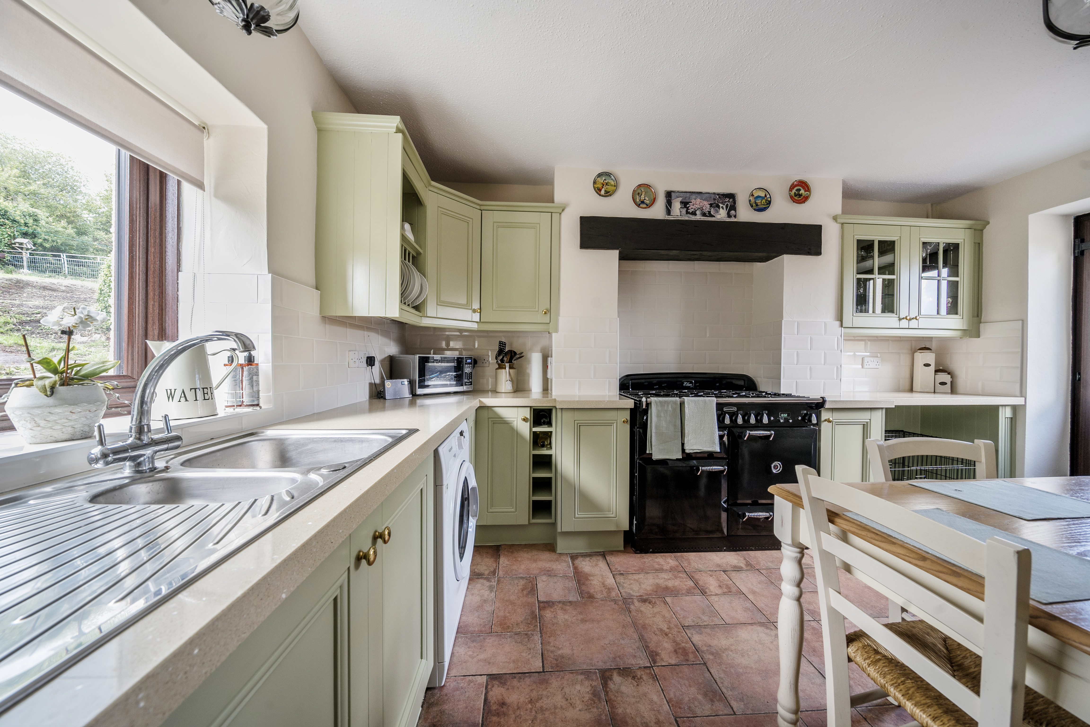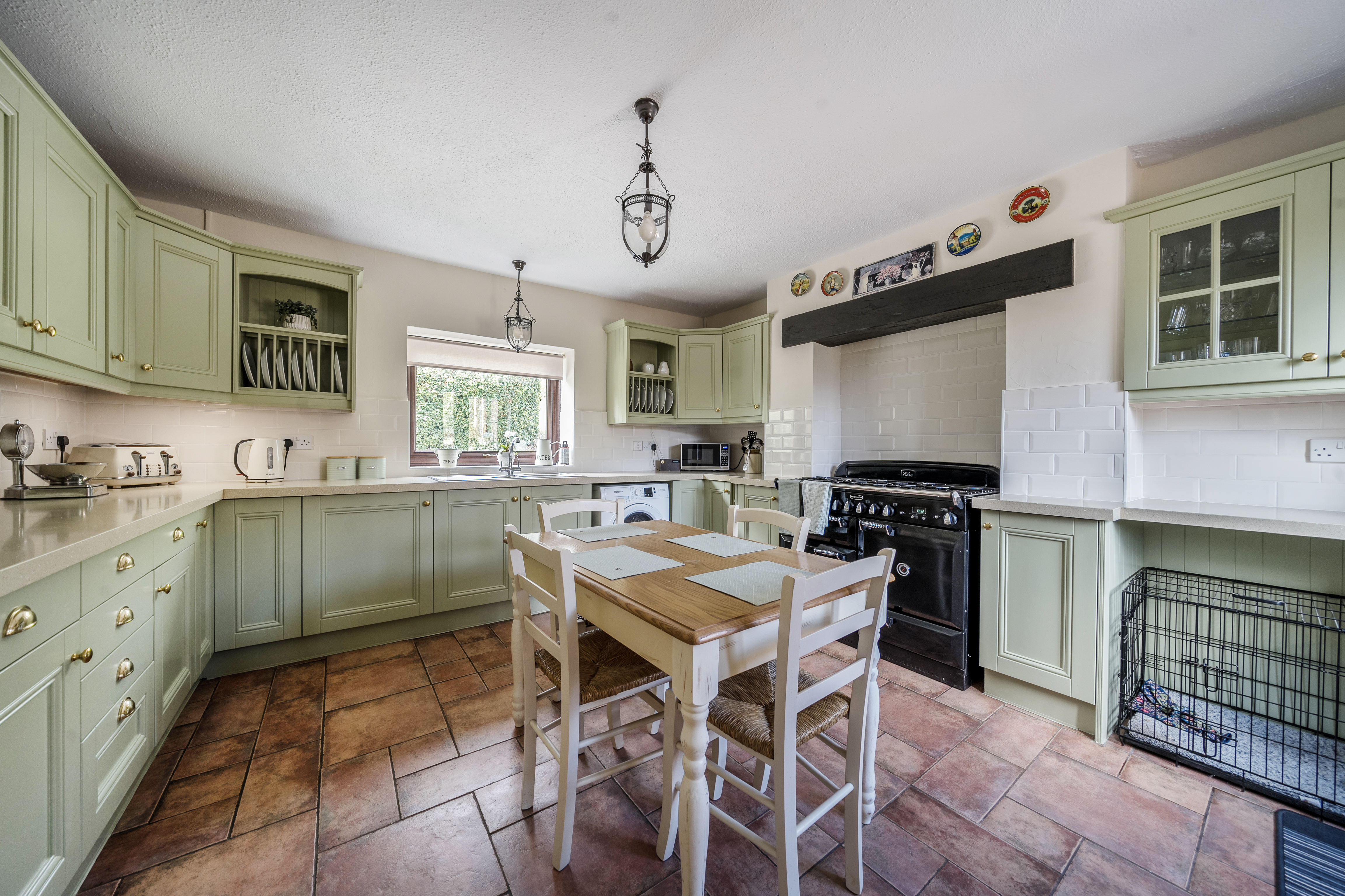 To the right of the hallway, the kitchen/breakfast room features a quality fitted kitchen with a traditional cottage feel, including a large range cooker, space for a fridge-freezer and other appliances, and ample room for a dining table. A door leads directly out to the garden's decking area, ideal for al fresco dining or soaking in the peaceful surroundings.