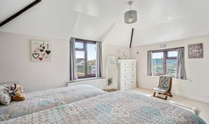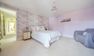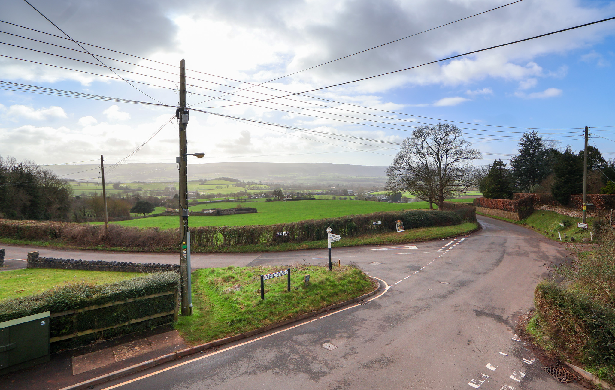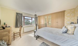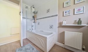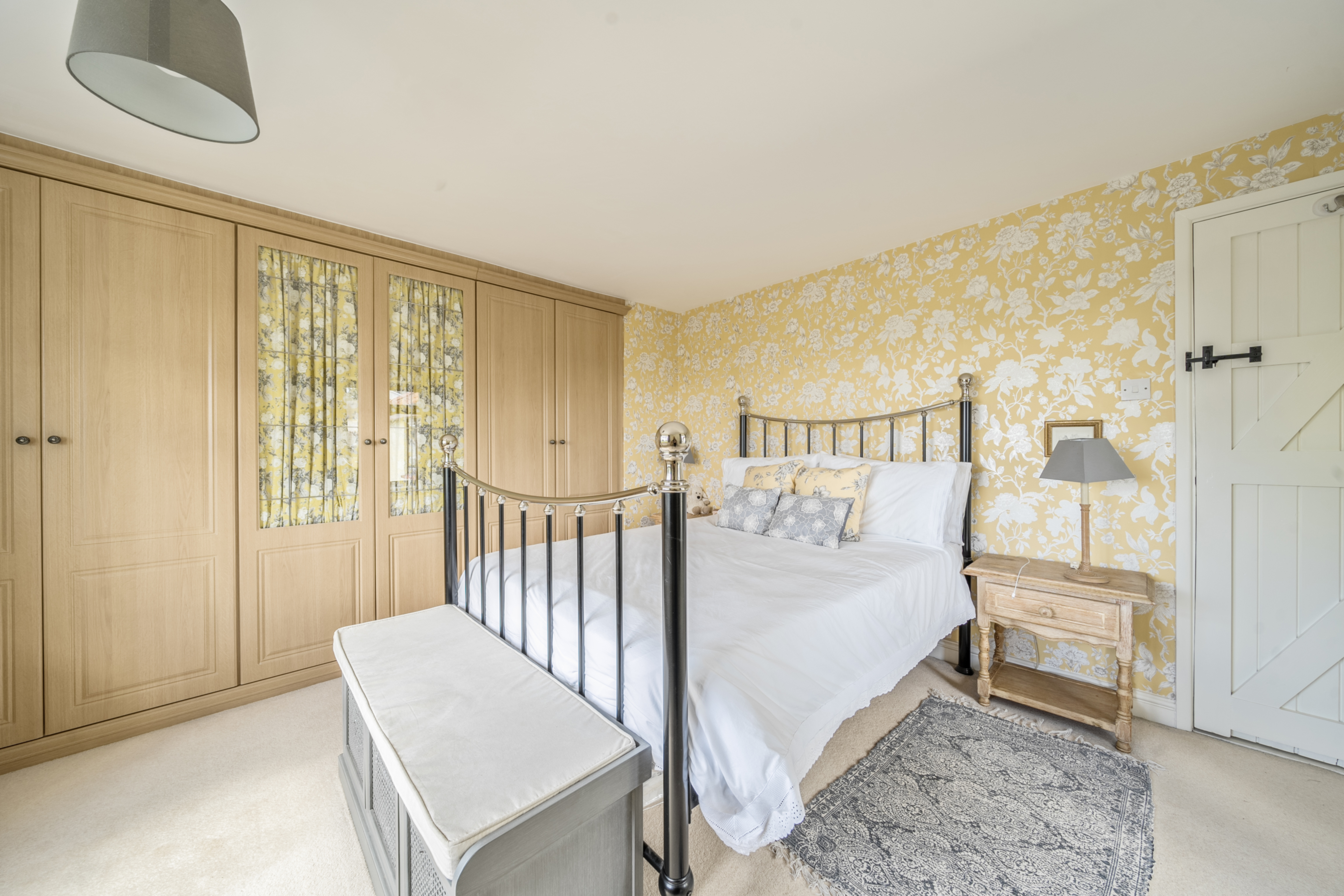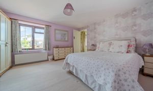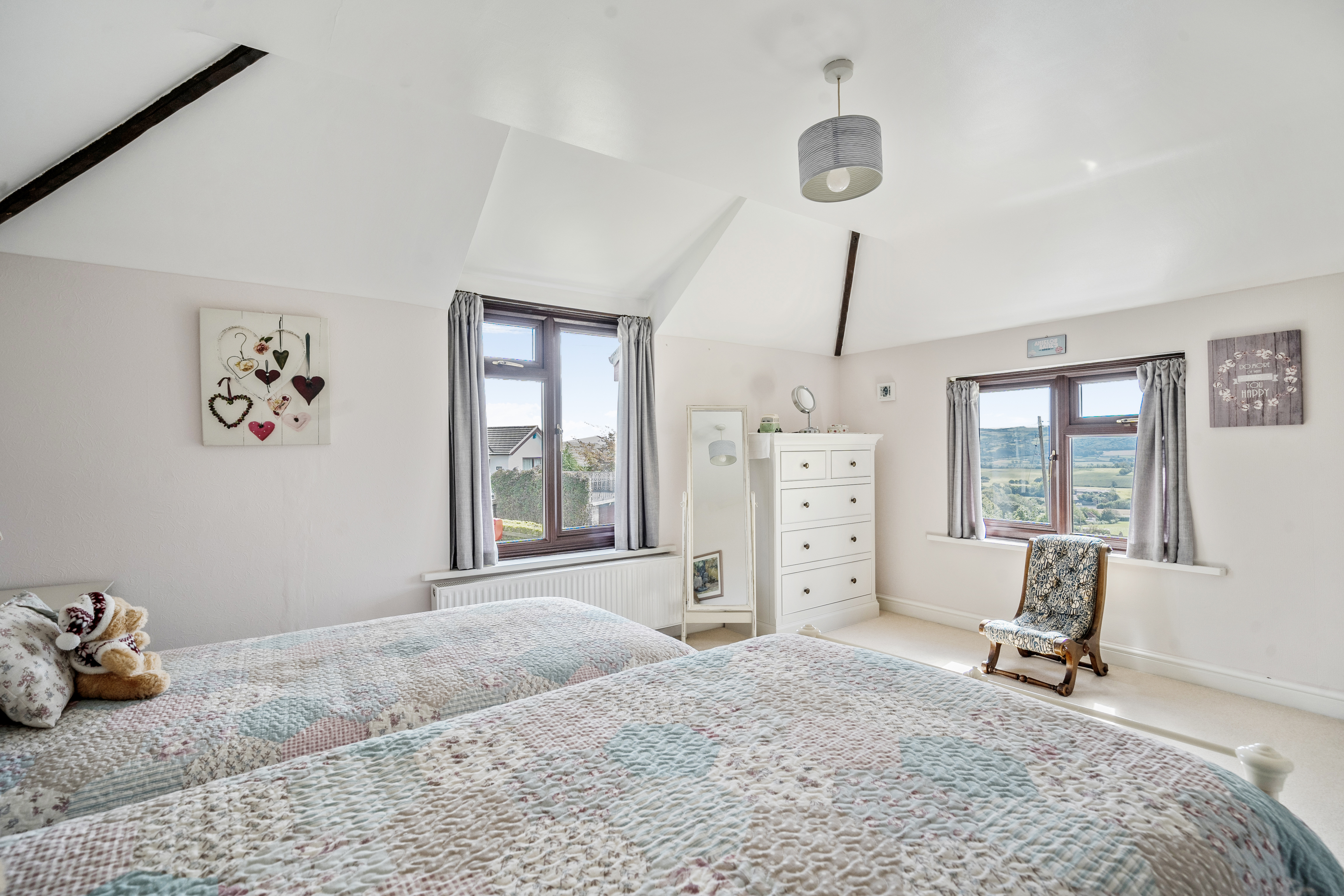 Upstairs, a spacious landing leads to four generously proportioned double bedrooms. The principal bedroom is a standout feature, with a wall of fitted wardrobes and commanding views across open countryside and the Mendip Hills, scenery that truly must be seen in person to be fully appreciated. A modern family bathroom with a three-piece suite completes the upstairs accommodation.