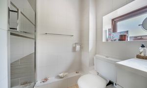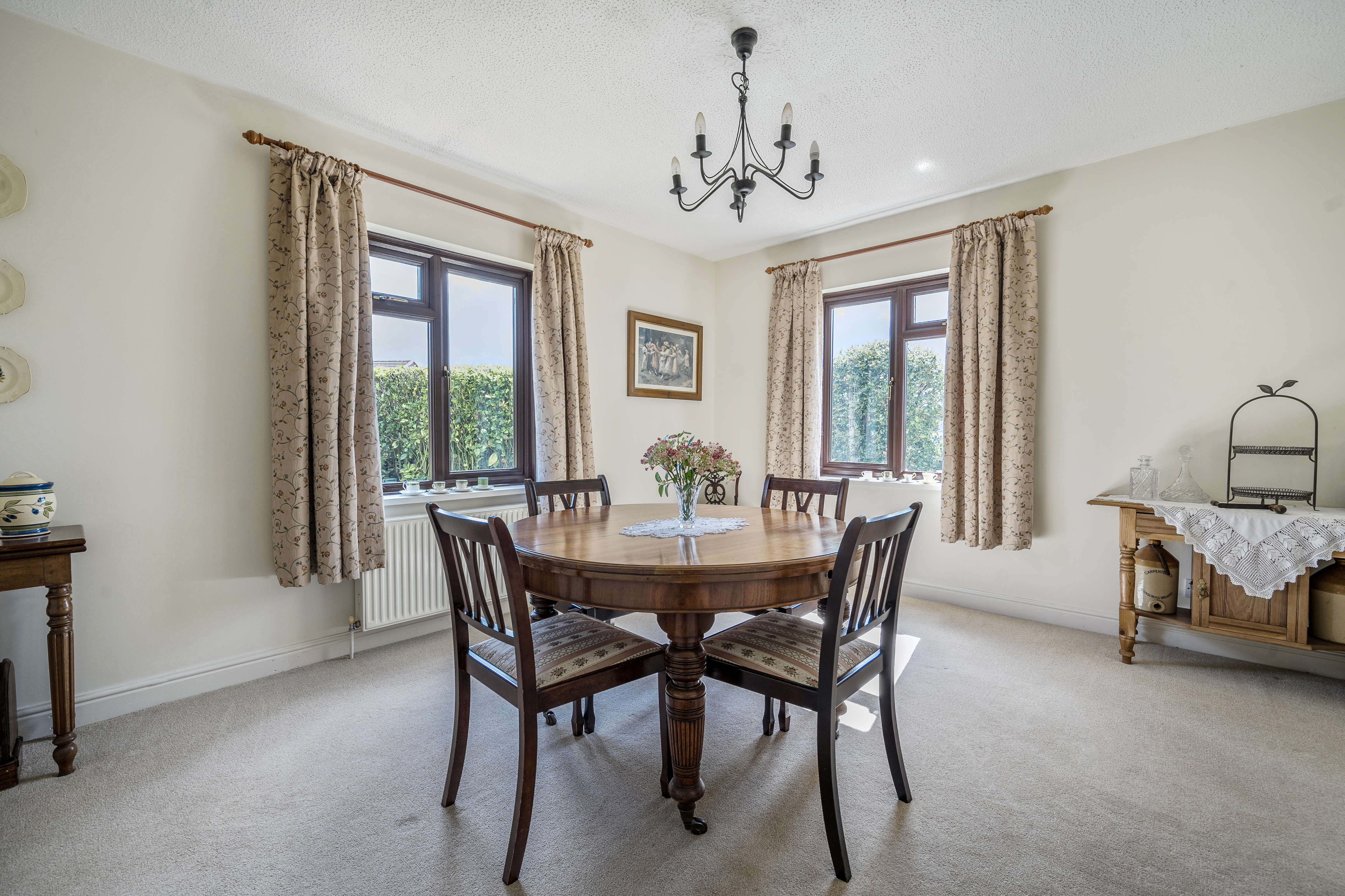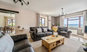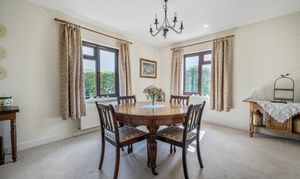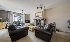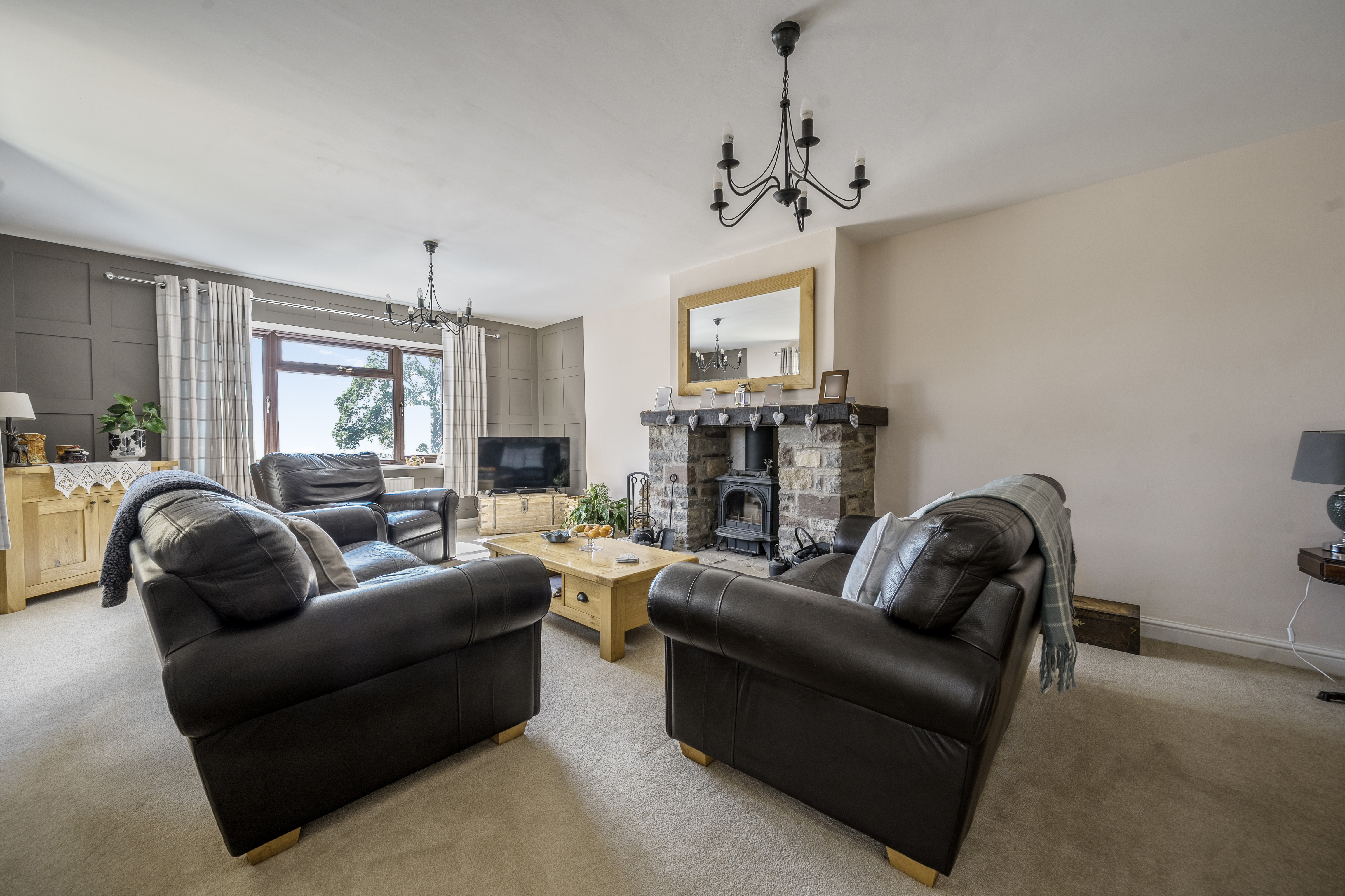 To the left, a generously sized dining room enjoys a dual aspect, creating a light and open atmosphere, perfect for entertaining or family meals. This space flows directly into the living room, another substantial reception area featuring a striking fireplace with a dual fuel burner as its centrepiece. A large front window captures some of the most beautiful views in the area, making it a perfect spot to relax.
