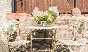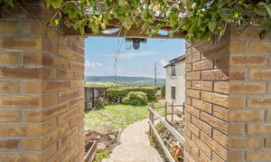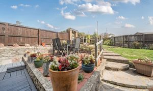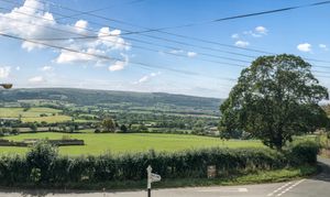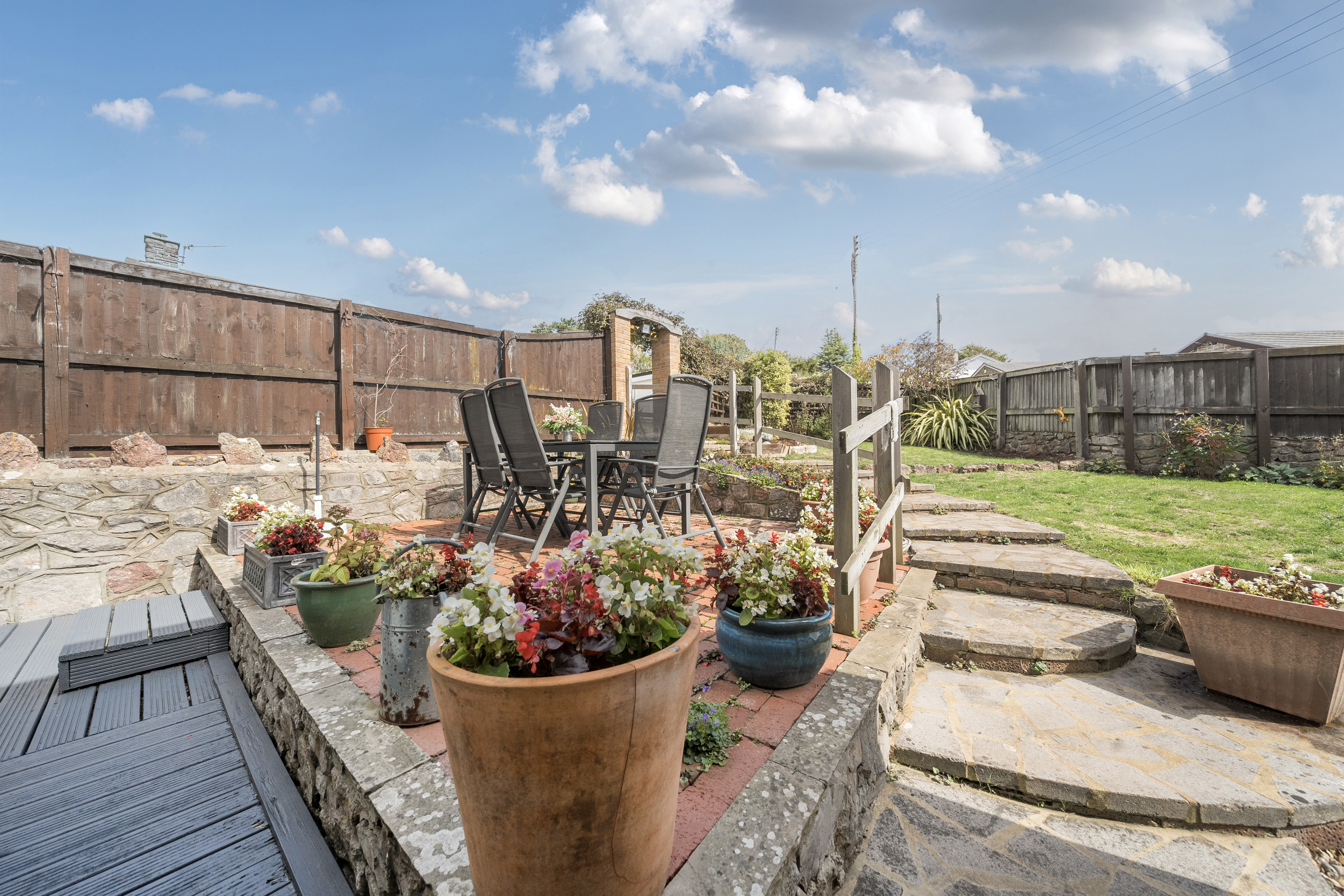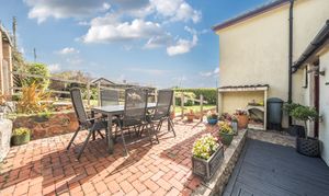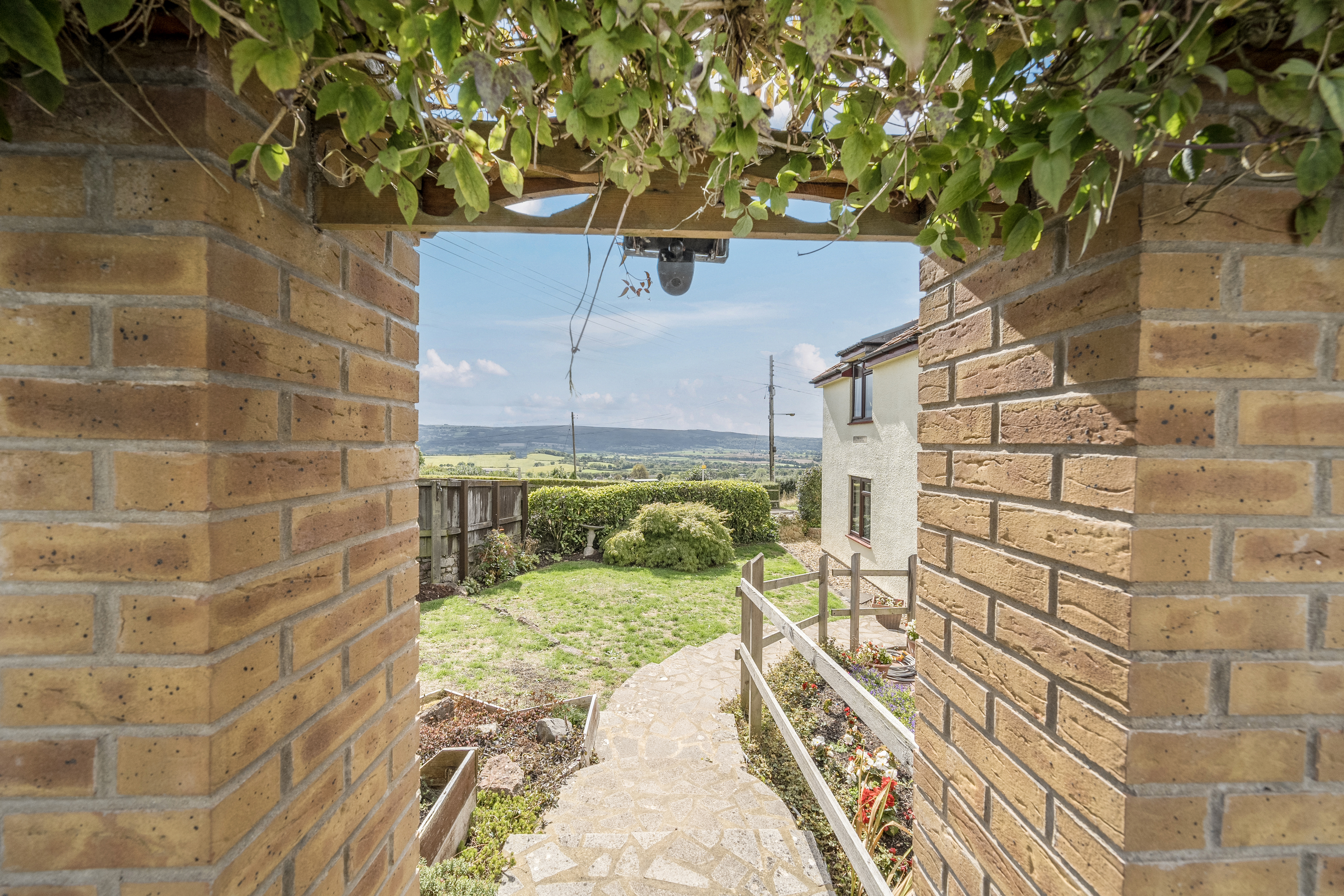 The gardens surrounding the property are thoughtfully laid out to complement the countryside setting, offering a charming, semi-cottage garden feel. Stepping out from the kitchen onto a decked area, the outdoor space rises to a second patio, perfect for seating and taking in the landscape. A gravelled path wraps around the side of the house, maximising the enjoyment of the views, while steps lead up to a higher section of the garden. This elevated area, with its own stunning outlook, connects through a brick archway to a large driveway and double garage, providing ample parking and practical storage.