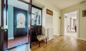 The property is accessed via a generously sized entrance porch with a practical quarry tiled floor, offering plenty of space for coats and shoes. From here, you enter a wide hallway that provides access to the main living areas and includes a large understairs storage cupboard for added convenience.