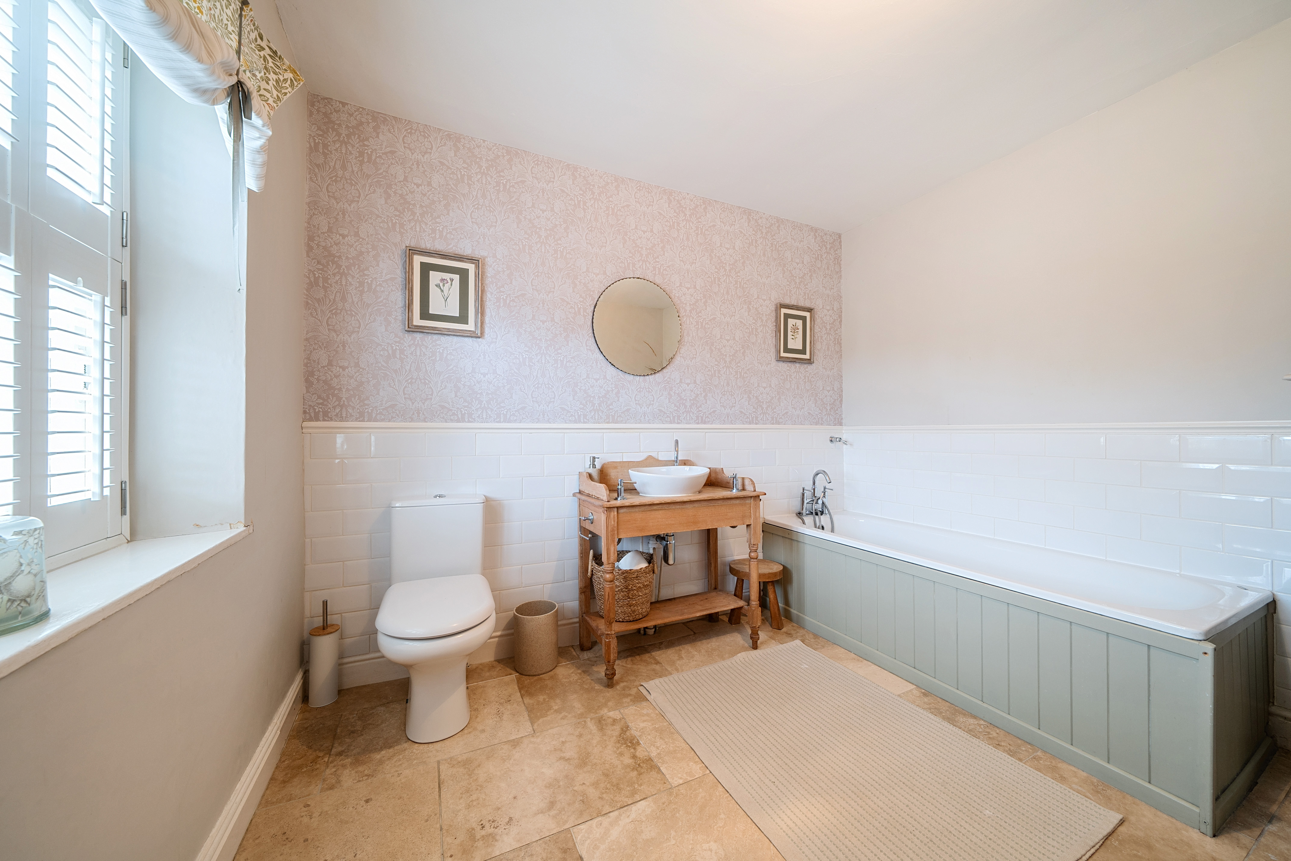A welcoming, original panelled front door, leads into an impressive entrance hallway that extends the full depth of the house, offering a charming view straight through to the gardens. To the left, the impressive dual aspect sitting room features a stunning limestone fireplace with a cast iron wood-burner and traditional shuttered sixteen pane windows. At the front of the drawing room, you'll find a fantastic office/study, believed to be the original farm office where workers were once paid.