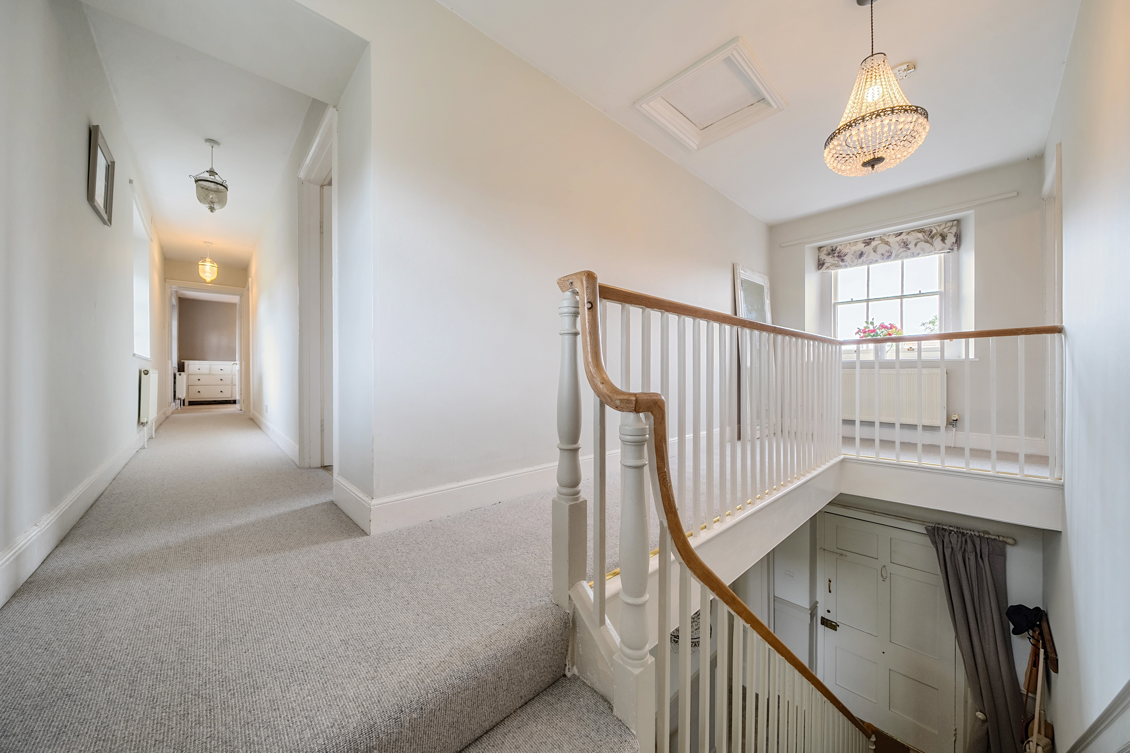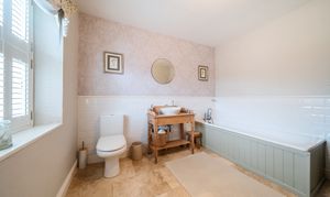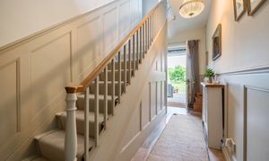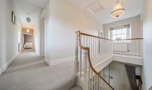Rising to the first floor, a glorious galleried landing grants access to all rooms, with a perfectly placed rear window overlooking the beautiful garden. The four double bedrooms include a dual aspect principal bedroom and guest bedroom, both featuring quality fitted wardrobes. The remaining two bedrooms are also generous doubles with front-facing views. A family bathroom - another beautifully appointed space featuring a classic three-piece white suite with high-quality fixtures and fittings completes the upstairs accommodation.