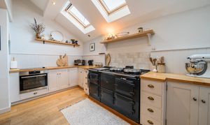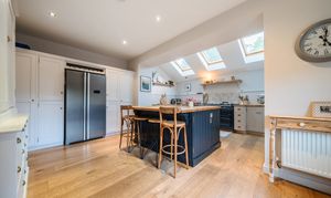 Beyond the dining room, a door leads to the stunning kitchen/breakfast room, which has undergone a tasteful and stylish renovation in recent years. The kitchen showcases a substantial range of handcrafted and painted farmhouse style units, a large central island with solid wood countertops, and an original Welsh dresser. A magnificent four oven gas AGA and an additional side oven provides a lovely warming focal point to this room. Tongue and groove, along with stone tiled splash backs, complement the units perfectly. Three Velux windows flood the room with natural light, and there is a door and window to the front, as well as a convenient store cupboard. The kitchen also includes various integrated appliances and space for a American-style fridge freezer.