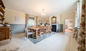 On the opposite side of the entrance hallway lies the elegant dining room, another striking dual aspect space. This room has panelling up to dado rail height, a hand-built cabinet in the chimney recess, a smart marble fireplace as a focal point, and painted floorboards that add a touch of rustic charm.