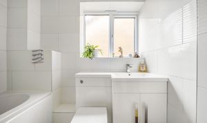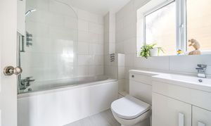 The kitchen, accessible from both the hallway and dining room, has been recently refurbished with sleek gloss units from Howdens and contrasting worktops, offering excellent storage and preparation space. It features a large Rangemaster cooker, integrated dishwasher, and space for a fridge freezer, washing machine, and tumble dryer. A door from the kitchen leads to the side of the property, ideal for convenient access to bins. A generous understairs cupboard provides additional storage, and a downstairs cloakroom completes the ground floor.