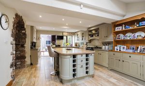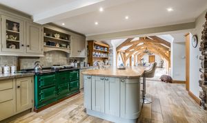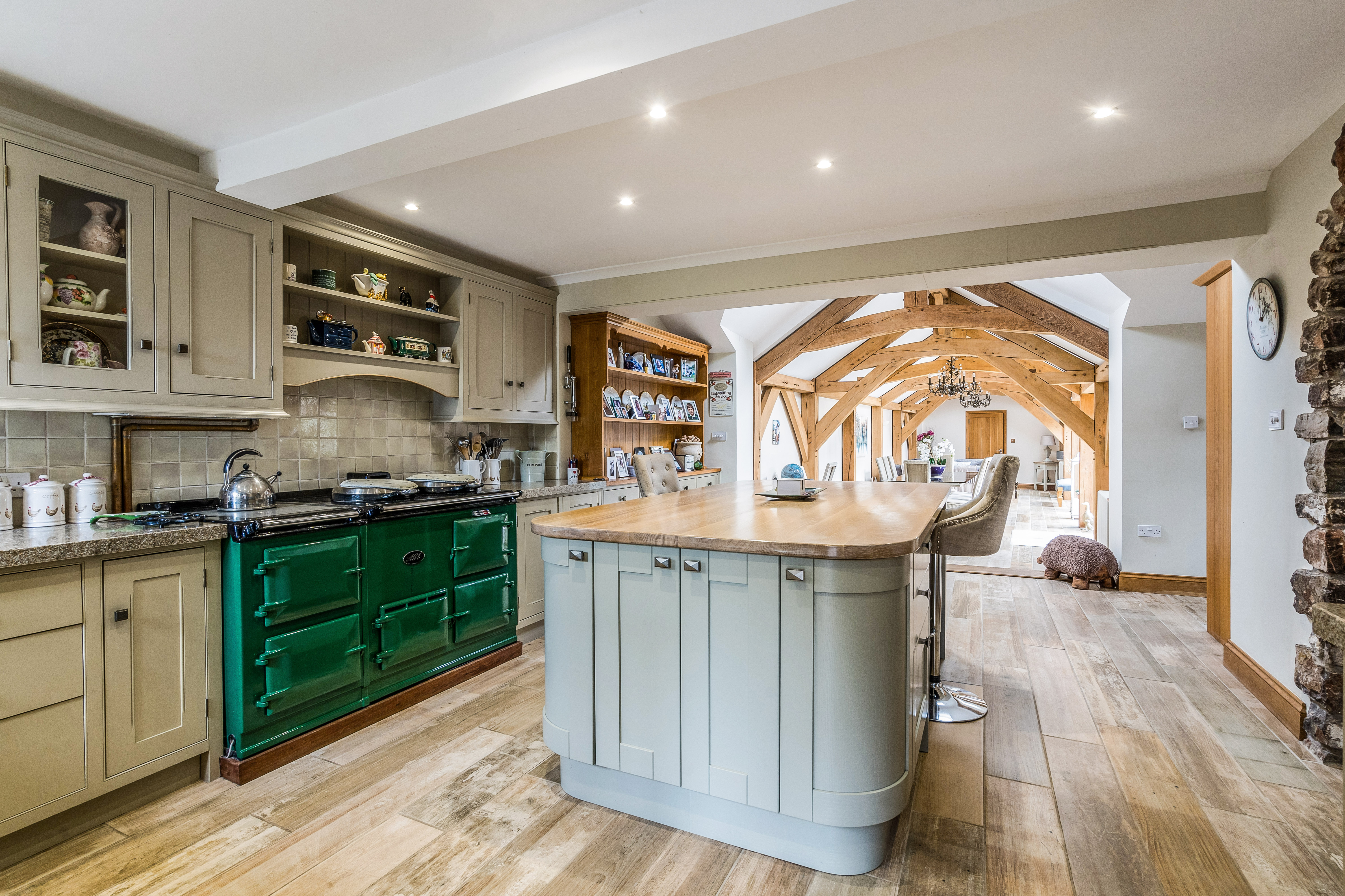 On the east side of the property a large office/study and family room with provide a further two lovely reception rooms and lead through to the kitchen which has recently been remodelled. It is a wonderful space with blue and cream painted wooden units, a matching dresser, a four-oven British racing Green AGA, island with integrated wine racks and a porcelain tiled floor by Mandarin that extends the length of the room and extends through to the spectacular orangery. 42ft long with green oak timbering and a run of bifold windows which open to the central courtyard of the property this stunning space offers a great opportunity entertaining for family and friends.