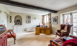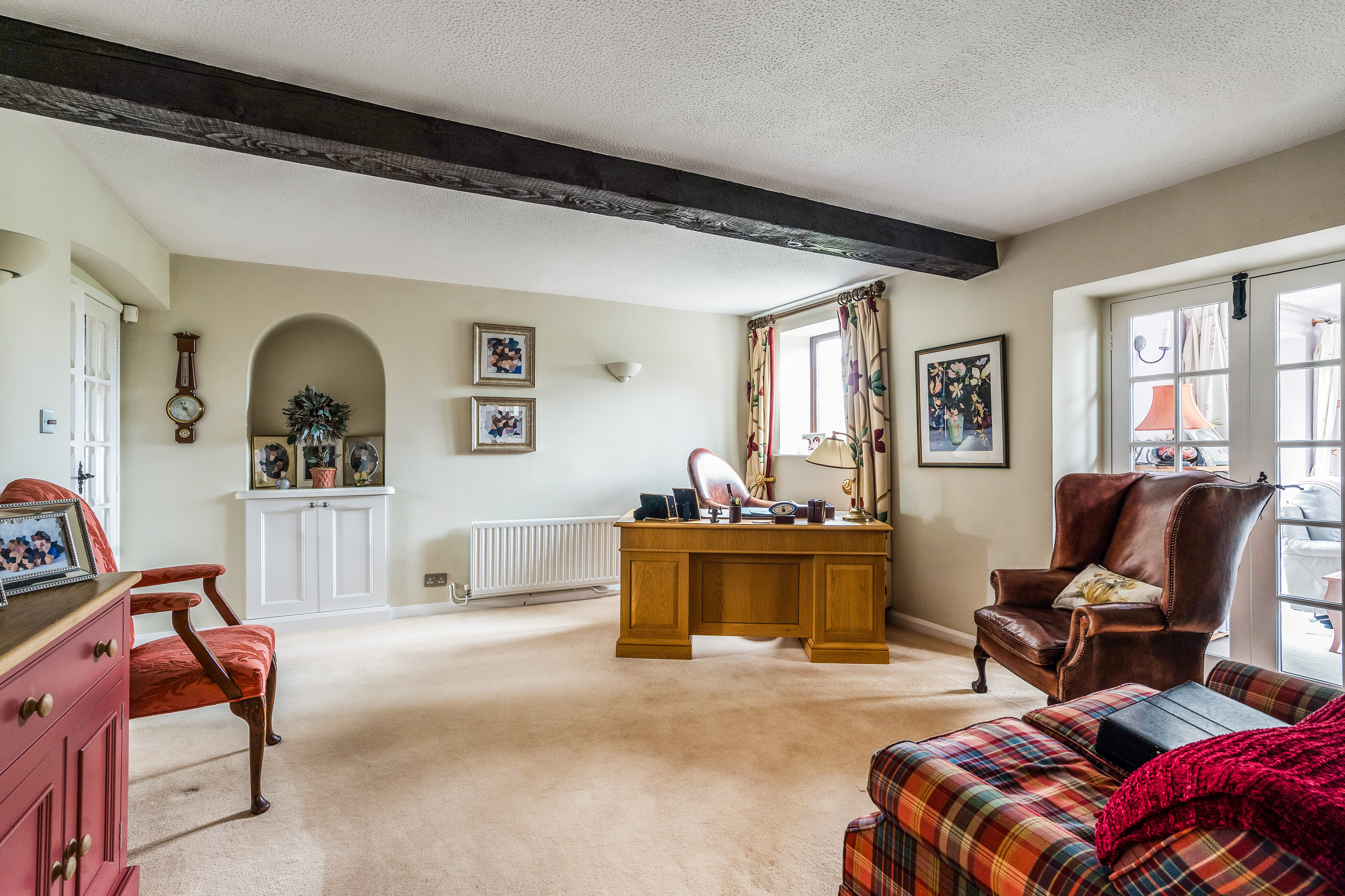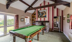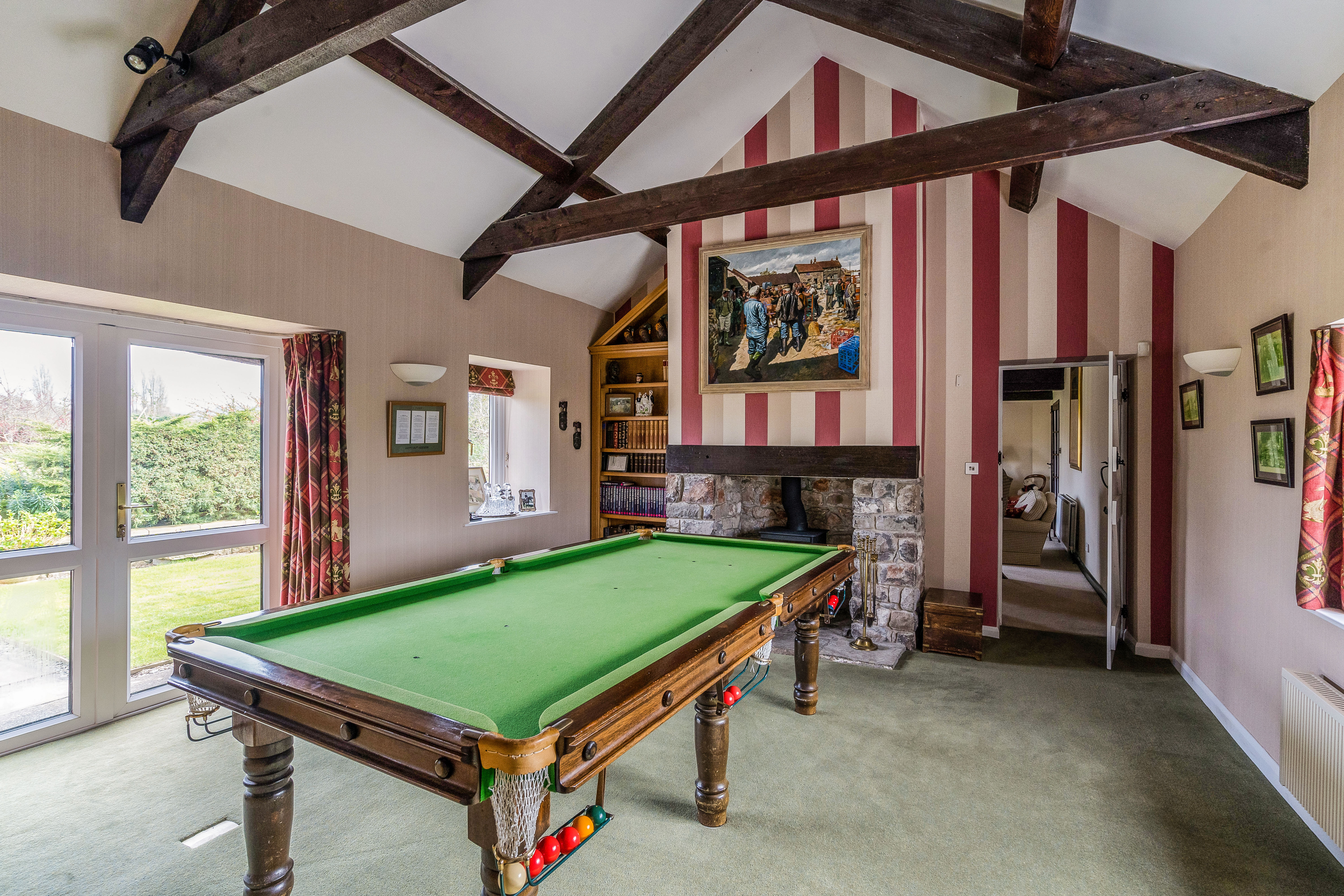 Returning to the sitting room a door leads through to the games room. Full of character, it has a beamed ceiling, another stone fireplace with log burner and bespoke fitted cabinetry with shelving in the alcoves, a dresser and sideboard all providing lots of useful storage. French doors from here open to the garden.