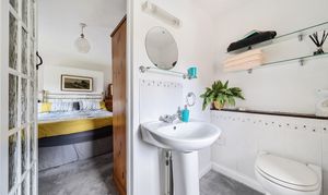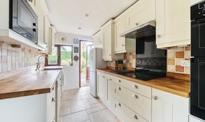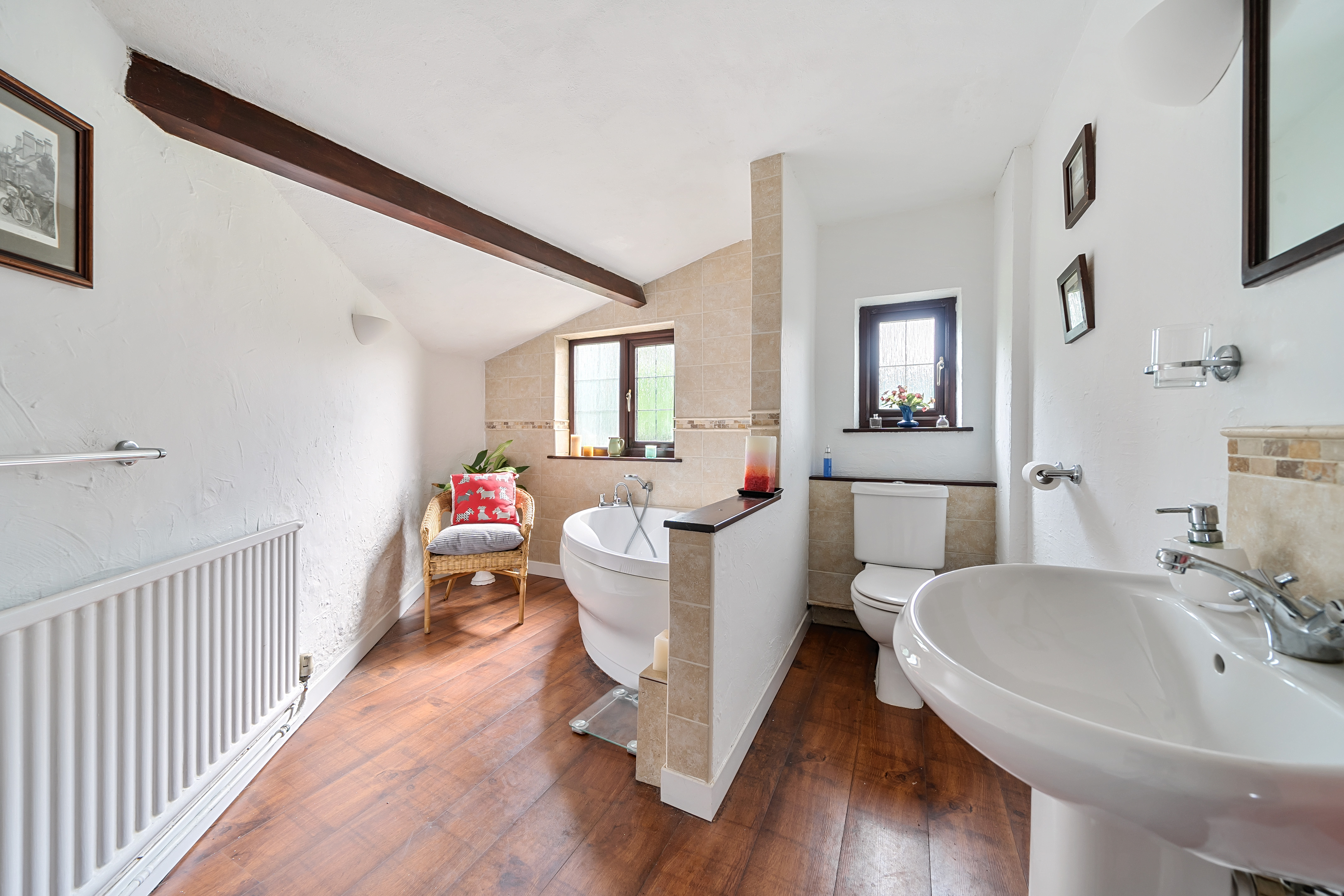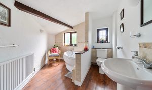 The final reception space is a kitchen/breakfast room. Fully fitted, with a farmhouse style kitchen it has an induction hob, double oven, microwave, integrated wine rack, space for a fridge freezer, dishwasher and washing machine. There is also a downstairs bathroom with corner bath leading off the kitchen and a walk in pantry.