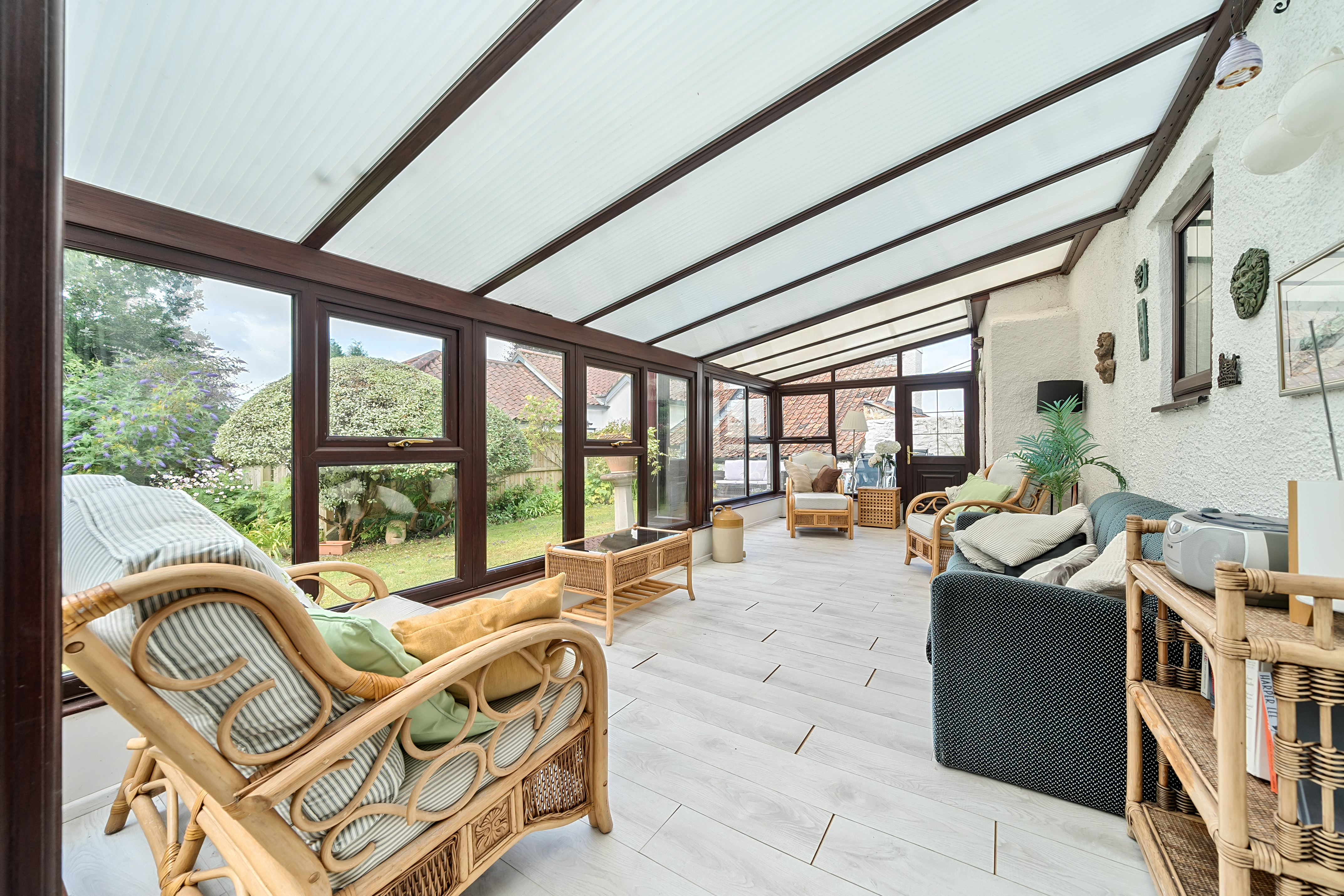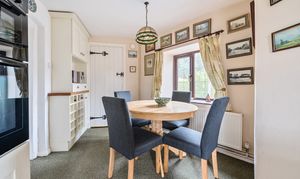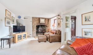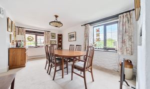 A sliding door from the study opens to a huge conservatory that spans the entire width of the property. This lovely bright space which has views over the private garden has ample space for sofas and could easily accommodate a play area too. A door returns to the hallway and right in to the sitting room which has an inglenook fireplace with log burner and recessed cupboards making this cosy room the ideal place to enjoy a winters evening. The dining room is another space brimming with character, with exposed whitewashed stone walls, a former bread oven and latched doors. It offers plenty of space for a large dining table.