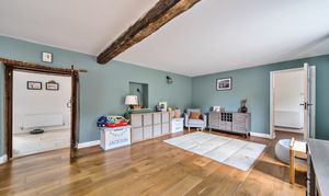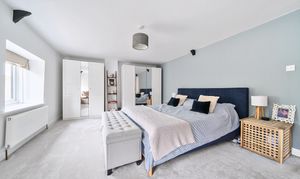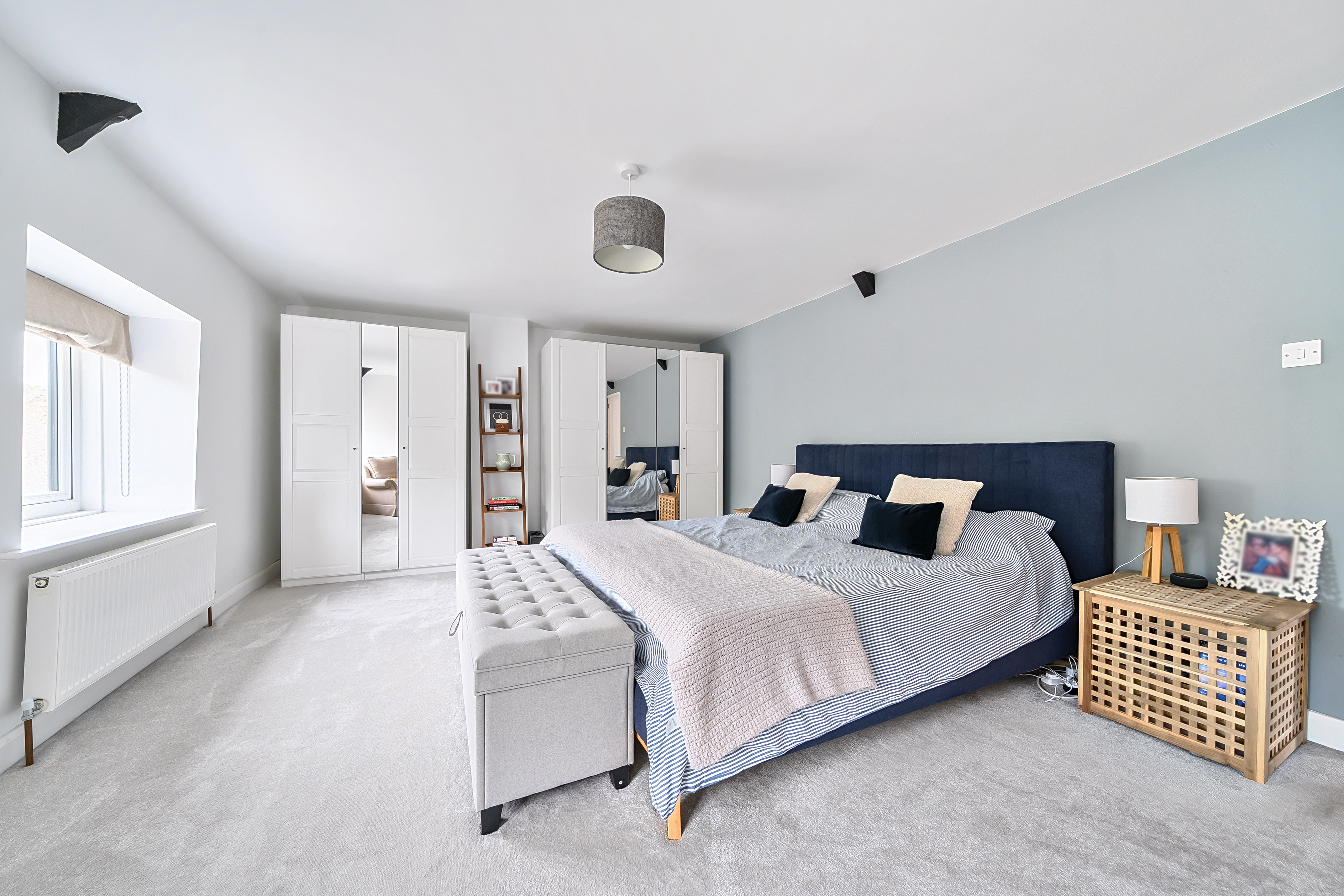 Upstairs, there are five generously sized bedrooms, each offering flexibility for family members or guests. The principal bedroom is filled with natural light and provides a peaceful retreat. The large galleried landing creates an additional seating area, offering a tranquil spot with views across the property and into the heart of the home.