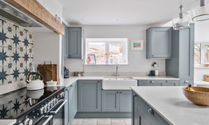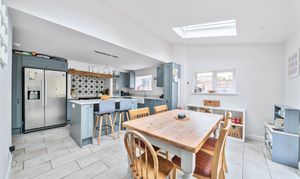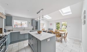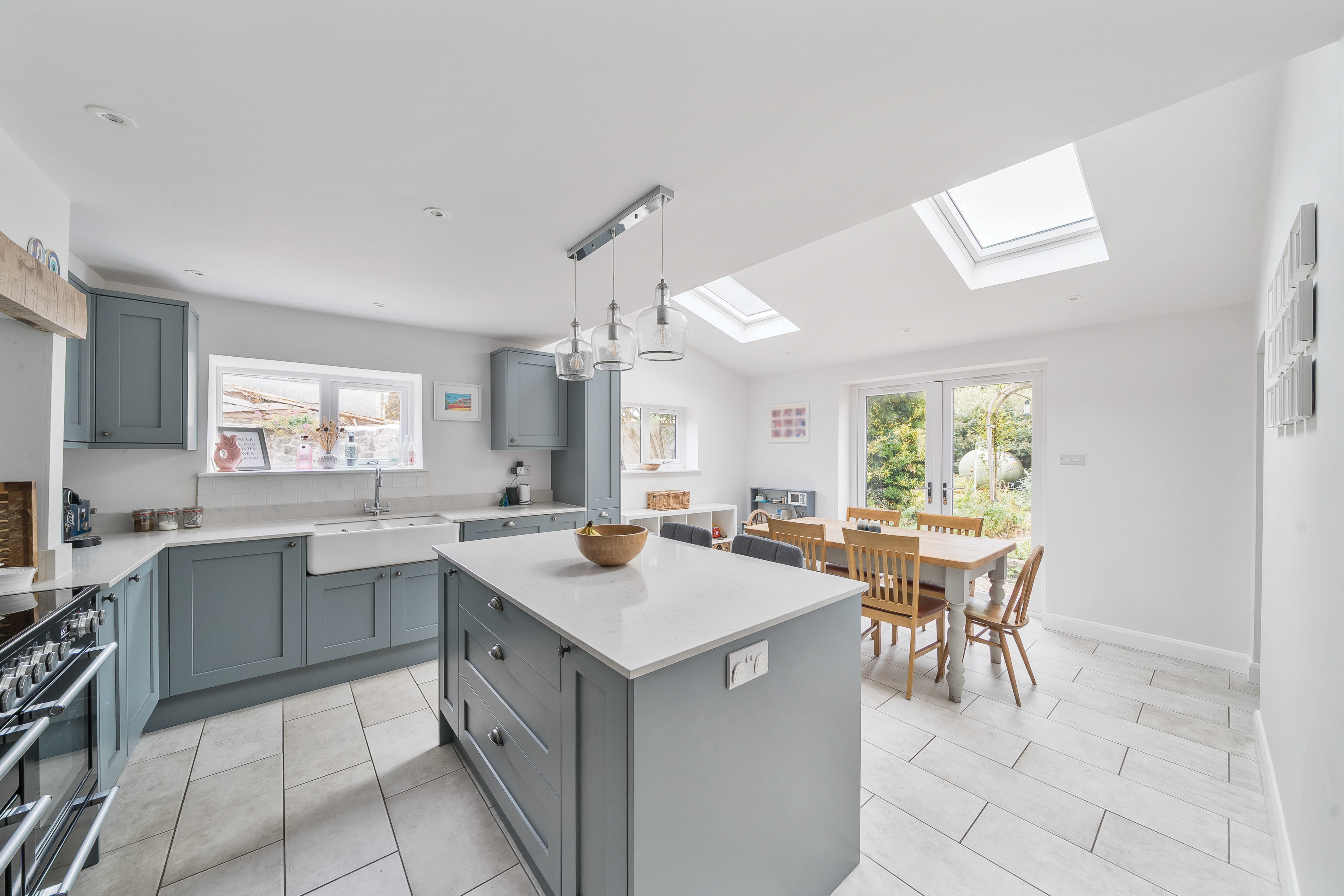 From here, a door leads into the kitchen/breakfast room — a generous space for both cooking and family gatherings. Extensively refurbished and extended just three years ago, it features shaker-style units in dove grey with contrasting white worktops and underfloor heating which adds a touch of luxury. A striking tiled splashback frames the range cooker, and a large island provides space for breakfast seating. There is also an American-style fridge/freezer, integrated dishwasher, and plenty of room for a dining table. French doors open onto the terrace and garden, seamlessly connecting indoor and outdoor living.