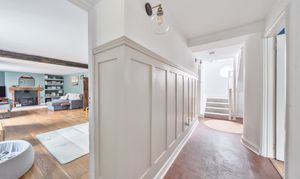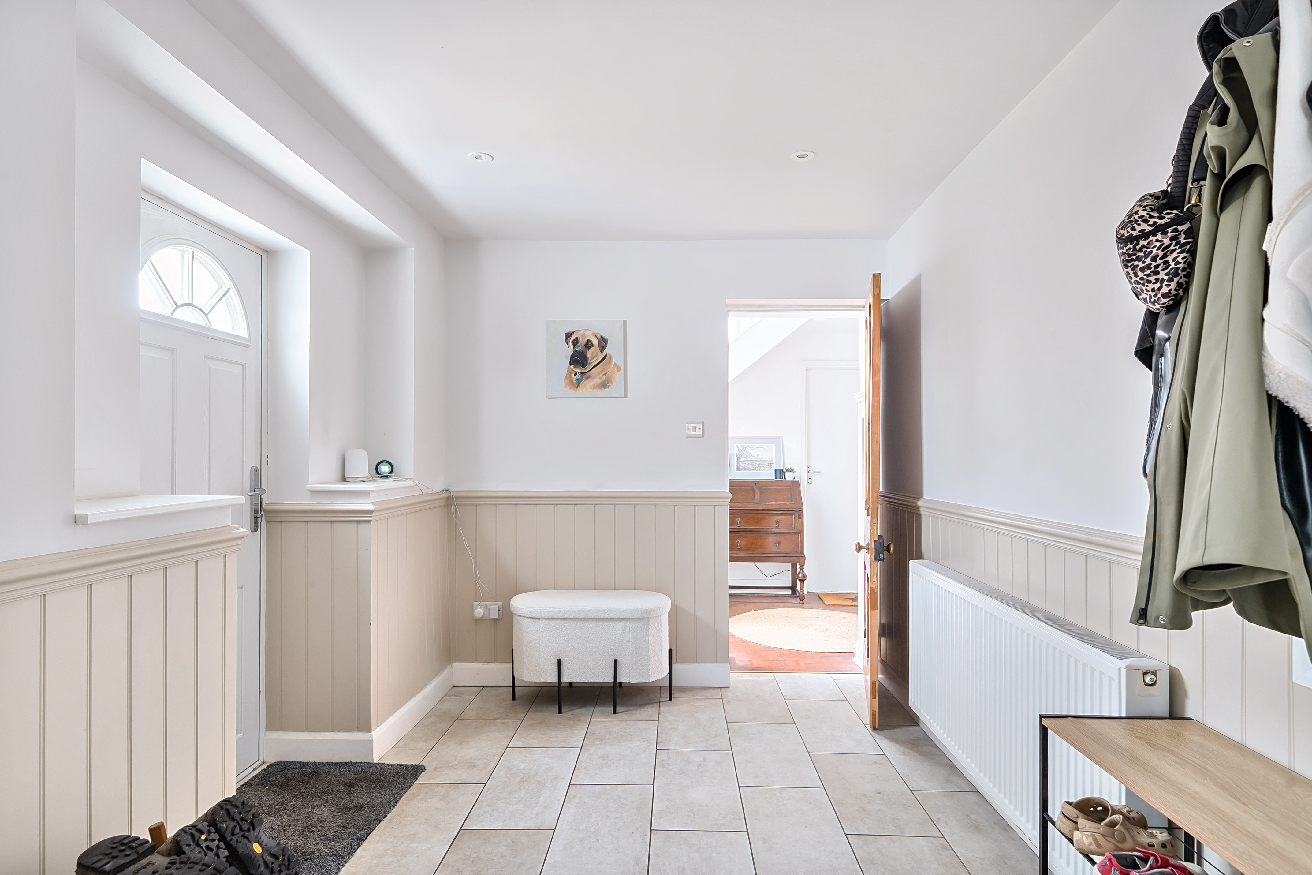 A welcoming front door opens into the hallway, where the quality of finish is immediately clear. Two-tone panelled walls in calming natural shades are perfectly complemented by parquet flooring.