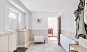 A practical utility room, with washing machine, tumble dryer, sink and extra storage, sits off the kitchen and from both the kitchen and hallway there is access to a boot room with downstairs cloakroom (including shower). With direct garden access, it is ideal for muddy boots, pets, and additional storage.