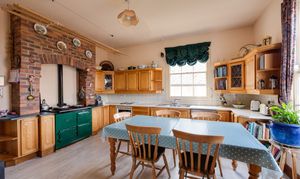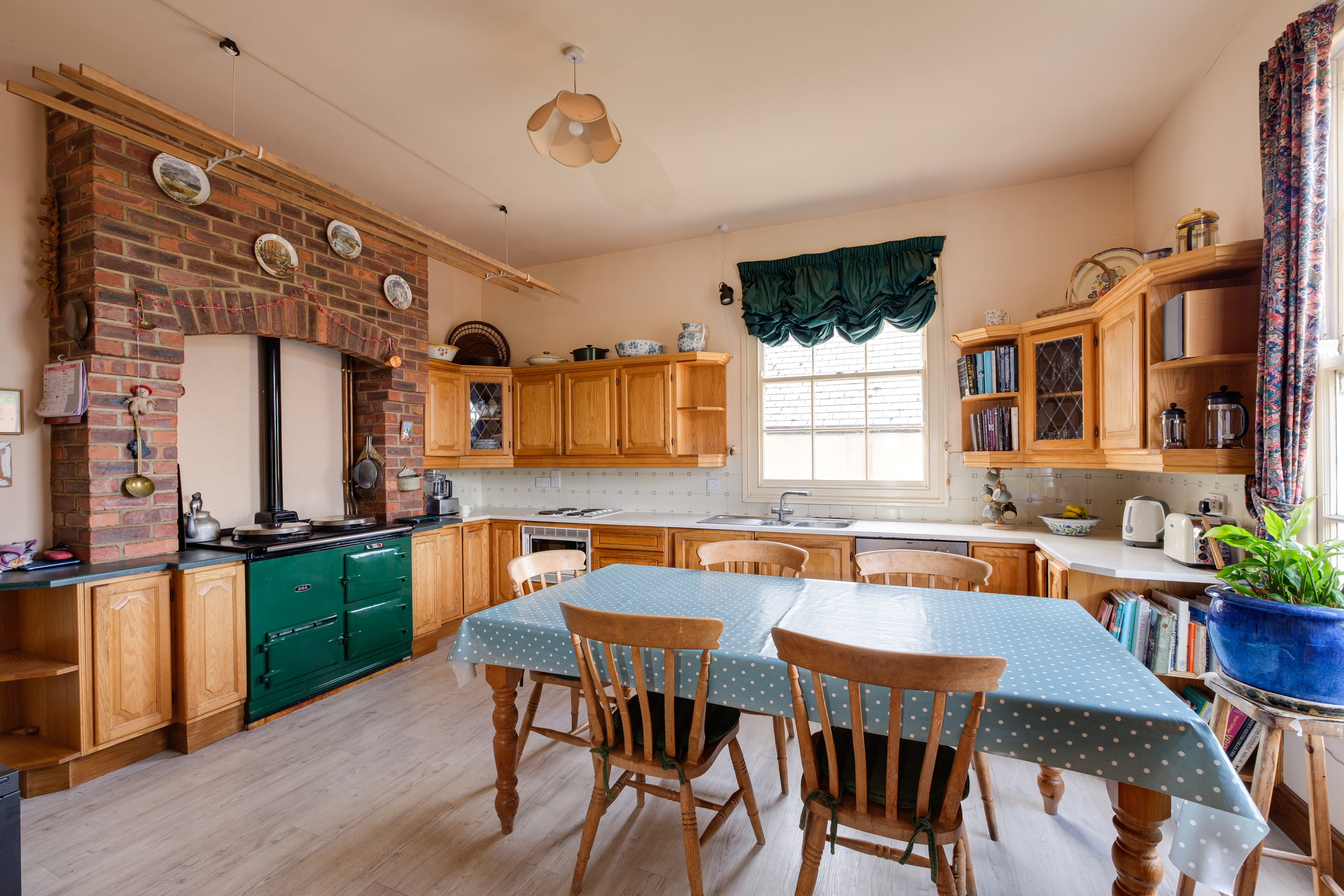 The final reception room is a large, open-plan kitchen/dining/living area. Fitted with solid wooden units designed by Winchmoor, it features an attractive brick-recessed fireplace with an inset racing green AGA. Integrated appliances include an electric hob, microwave, and dishwasher. The living area is spacious, with French doors opening onto a terraced area — perfect for summer barbecues or entertaining friends. A practical utility room provides space for a washing machine and valuable extra storage.