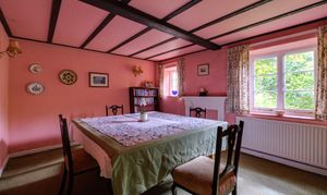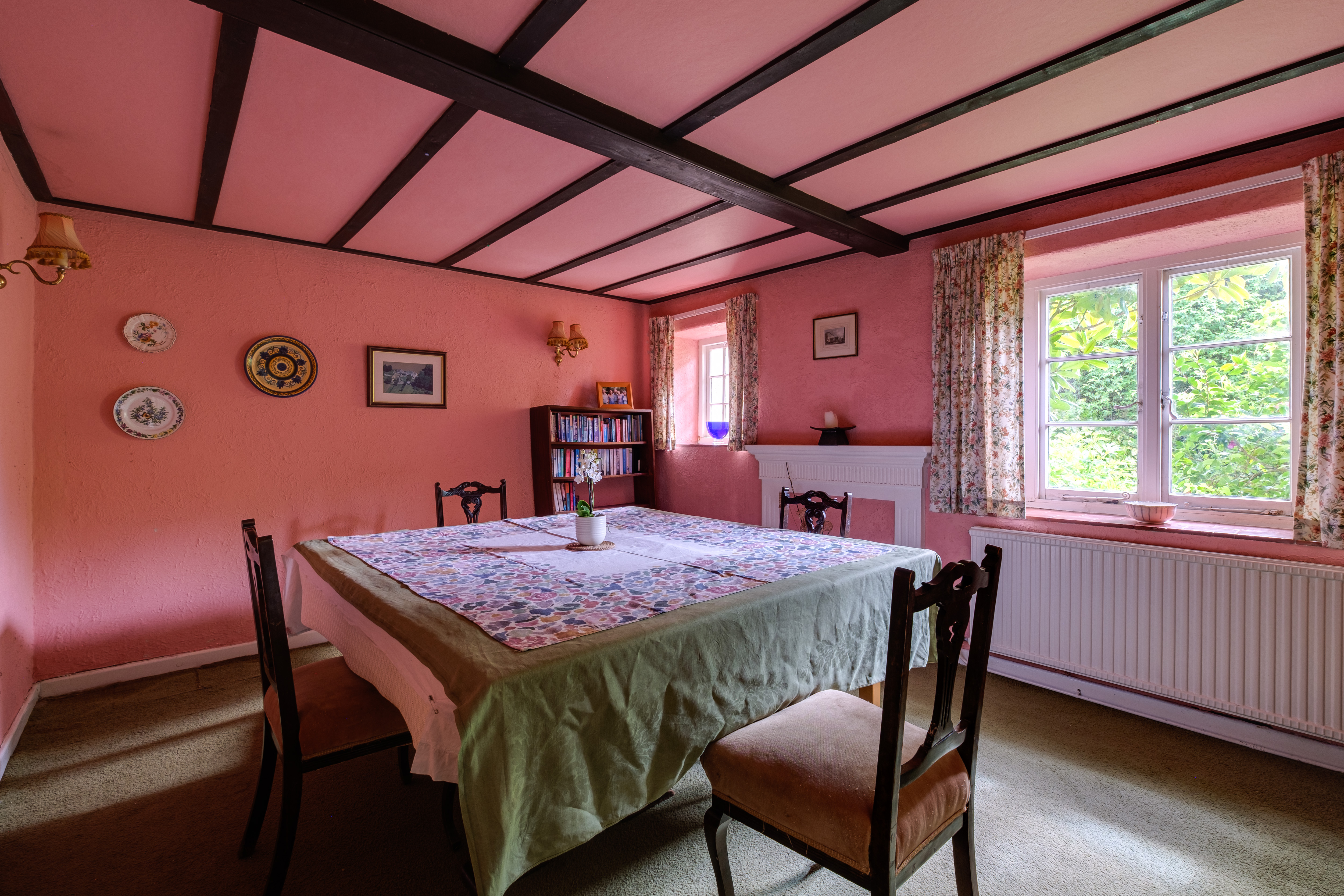 To the left is the dining room, an ideal entertaining space featuring deep recessed windows, fitted bookshelves, and a beamed ceiling.
