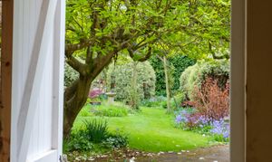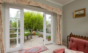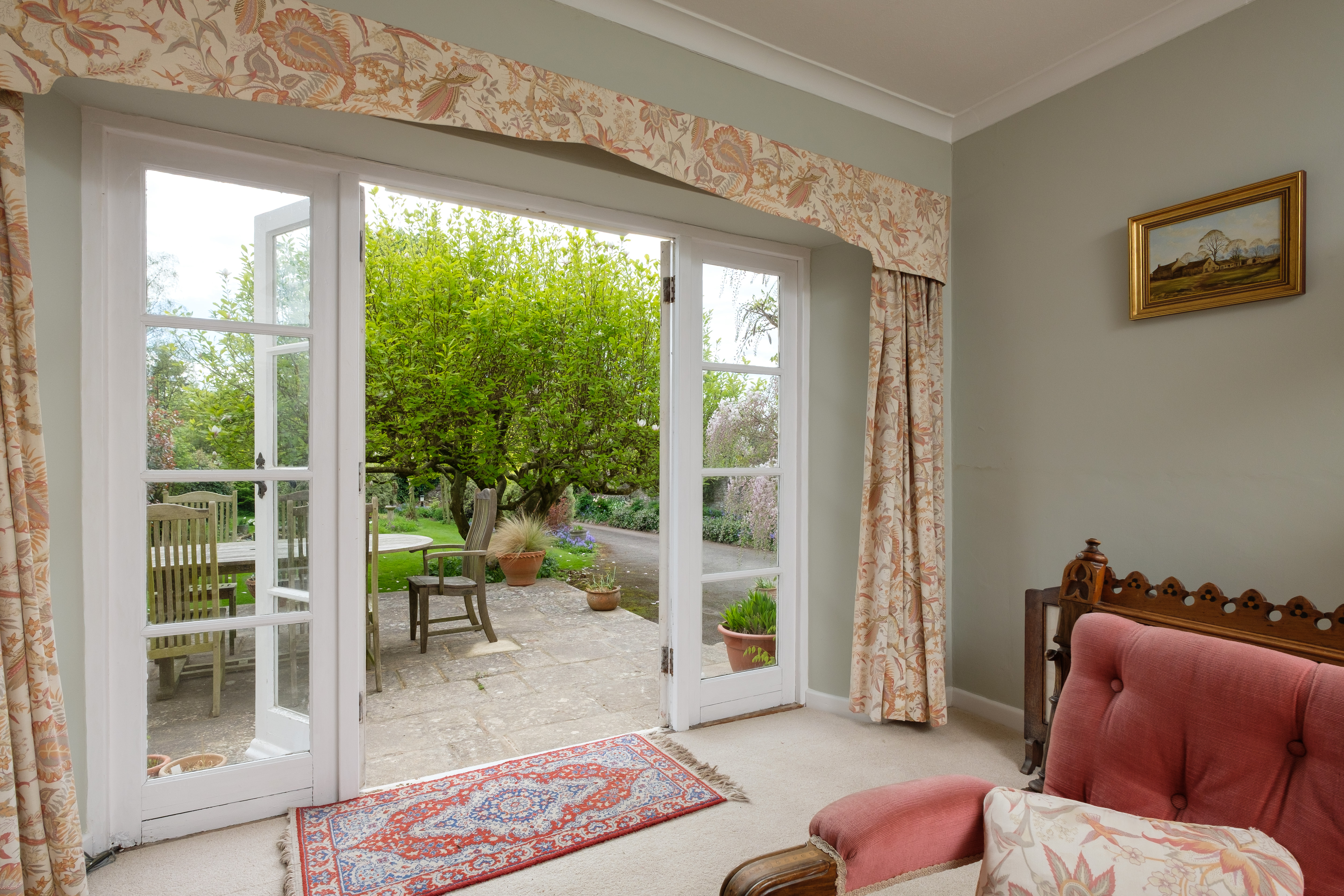 To the right is the sitting room, which boasts an open fireplace and double doors opening onto the garden, framing spectacular views of a magnolia tree.