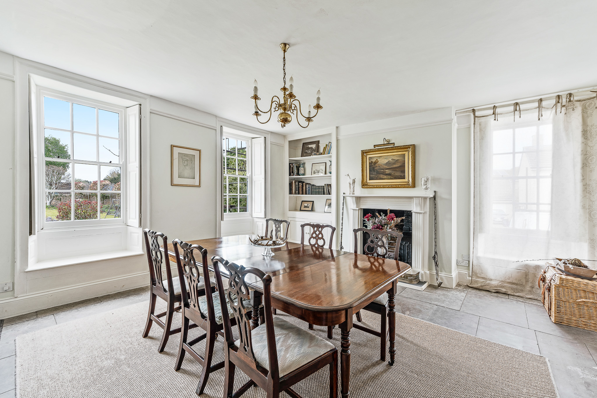 - Formal dining and sitting rooms with open fires, sash windows, shutters, and window seats