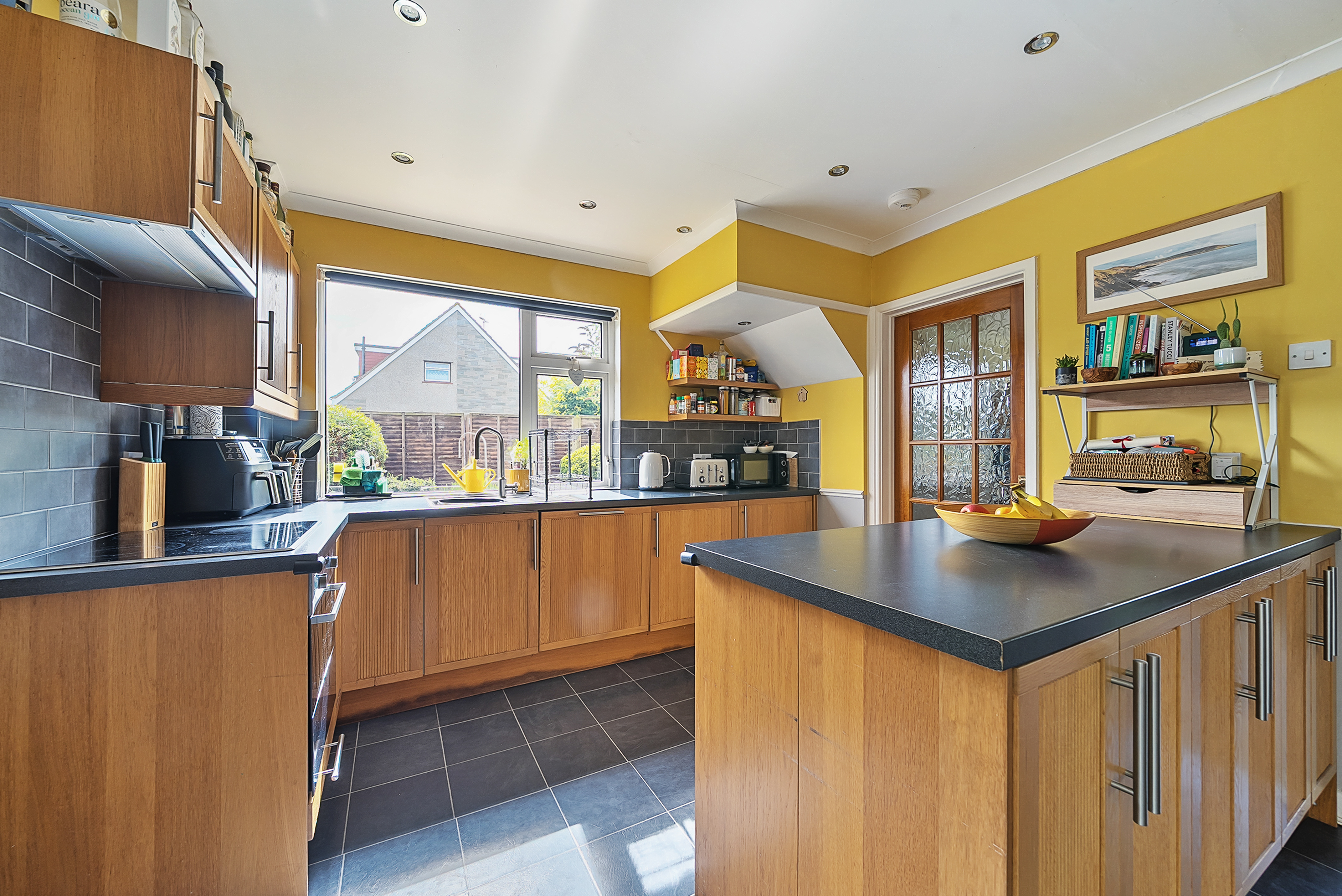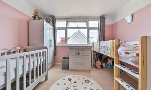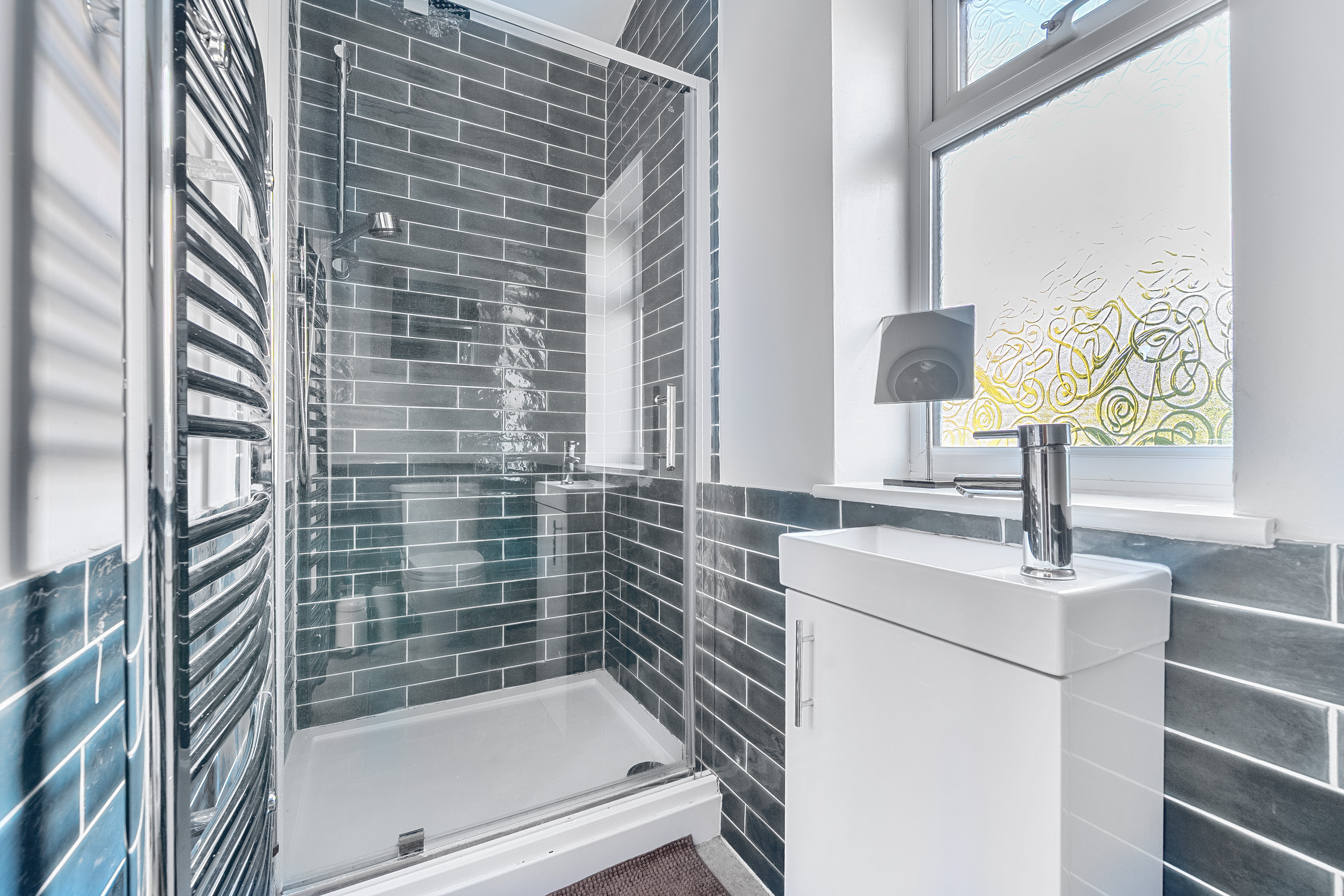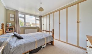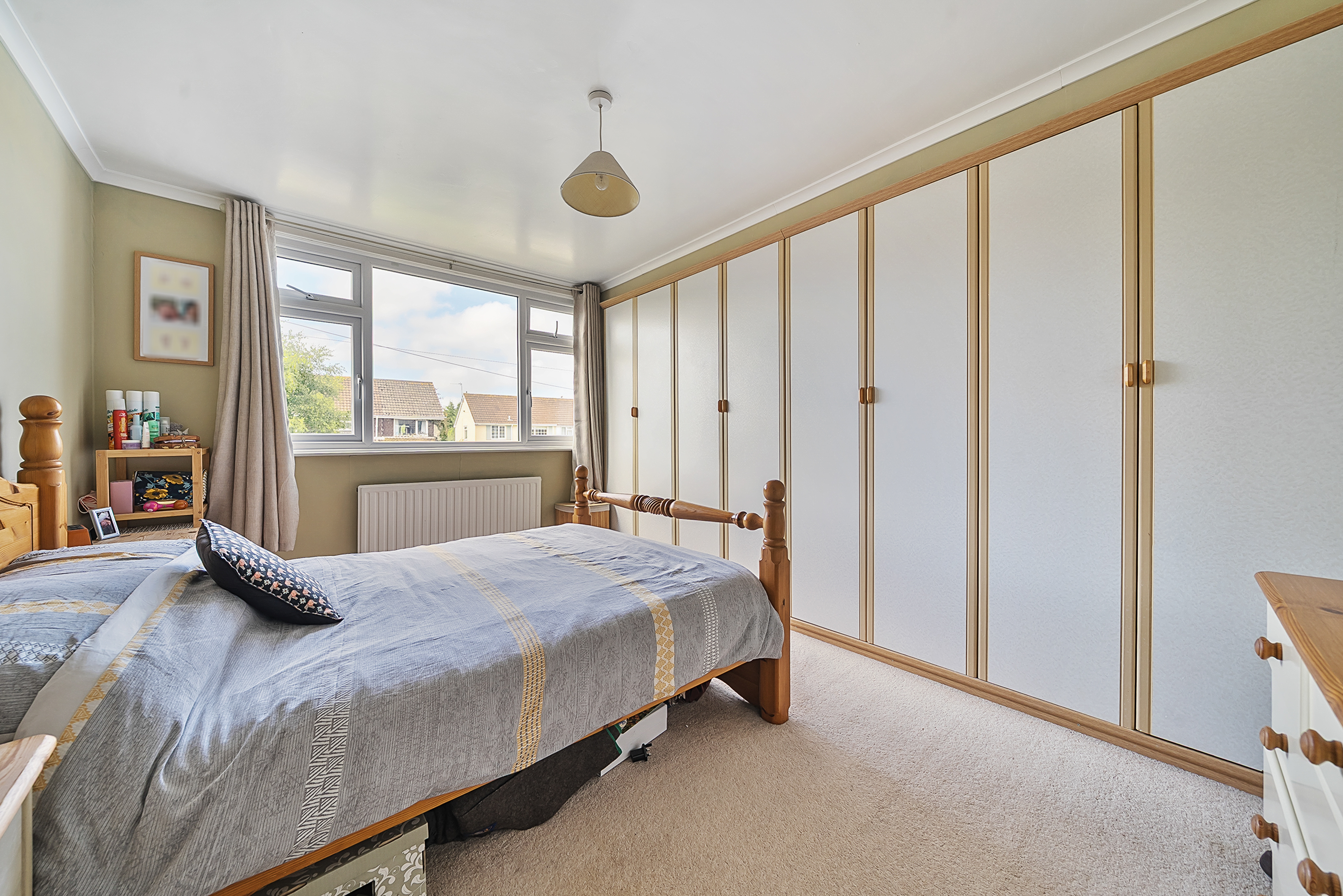 Upstairs, the landing gives access to three well-proportioned bedrooms, two of which are generous doubles. The principal bedroom includes a full wall of fitted wardrobes, offering excellent built-in storage. These rooms are served by a fully tiled family bathroom, fitted with a four-piece suite comprising a bath, separate shower cubicle, WC and wash basin.