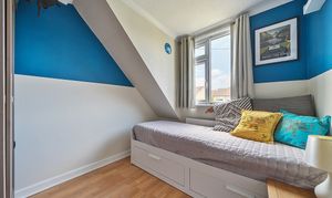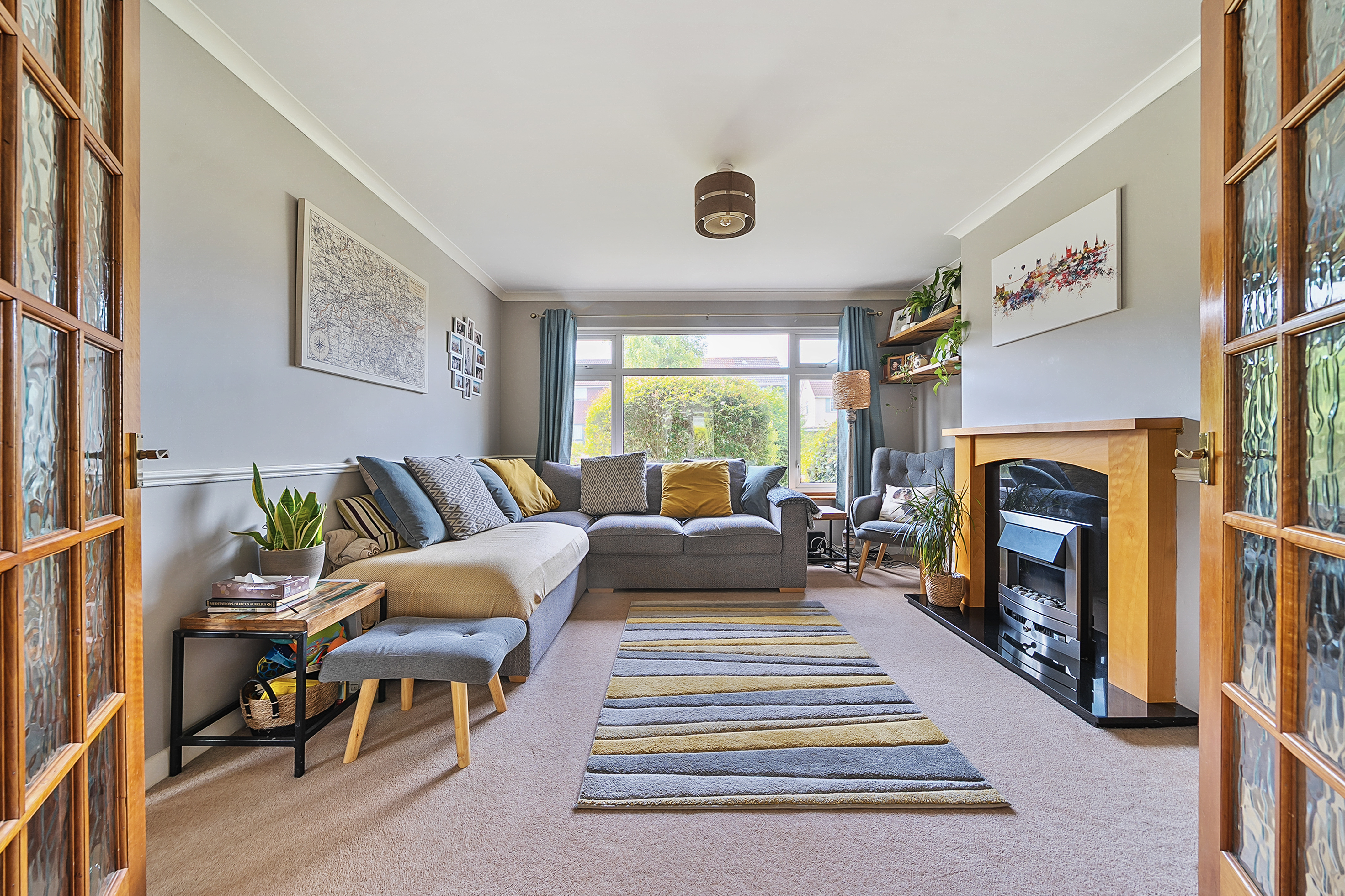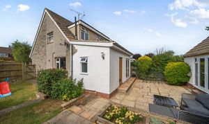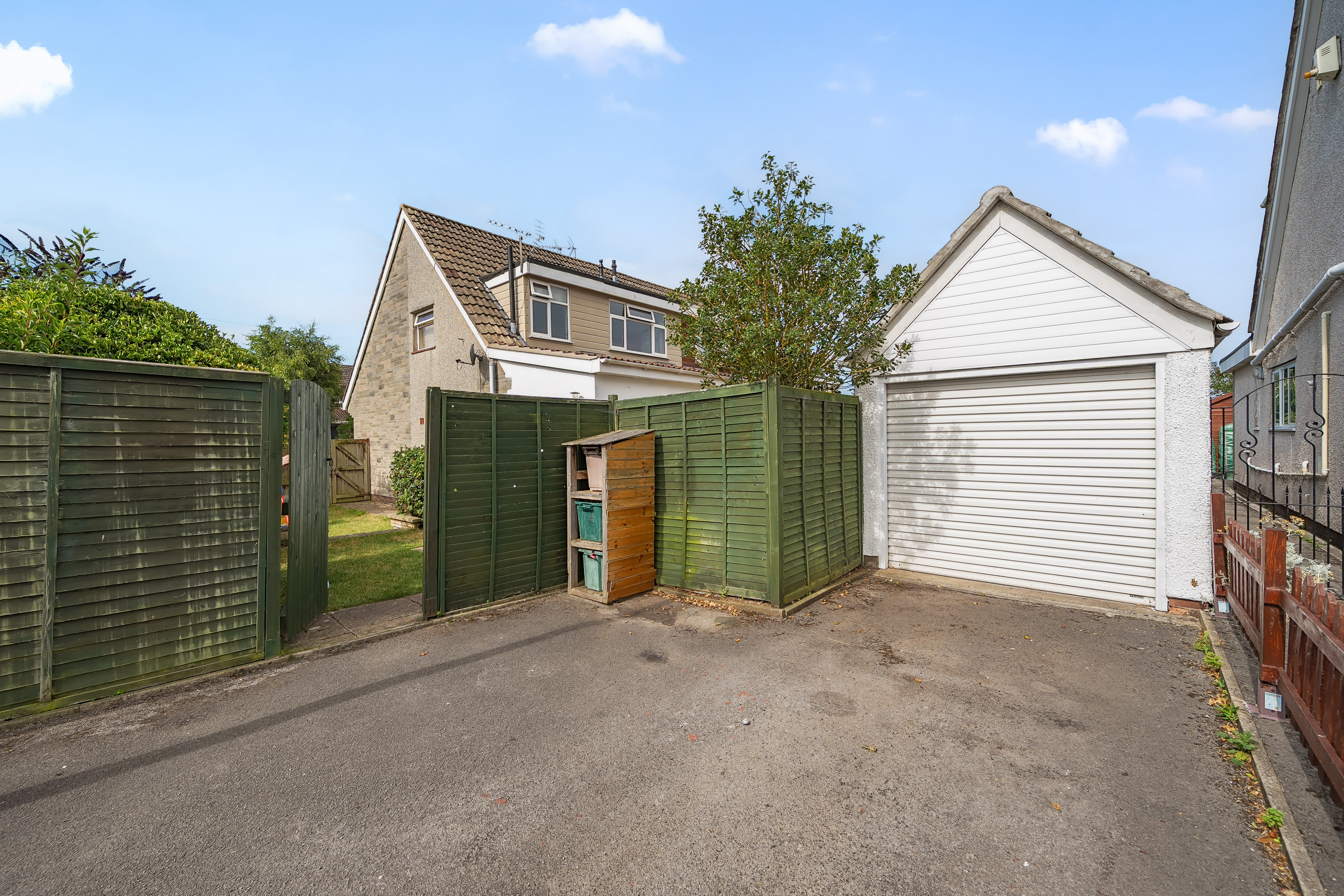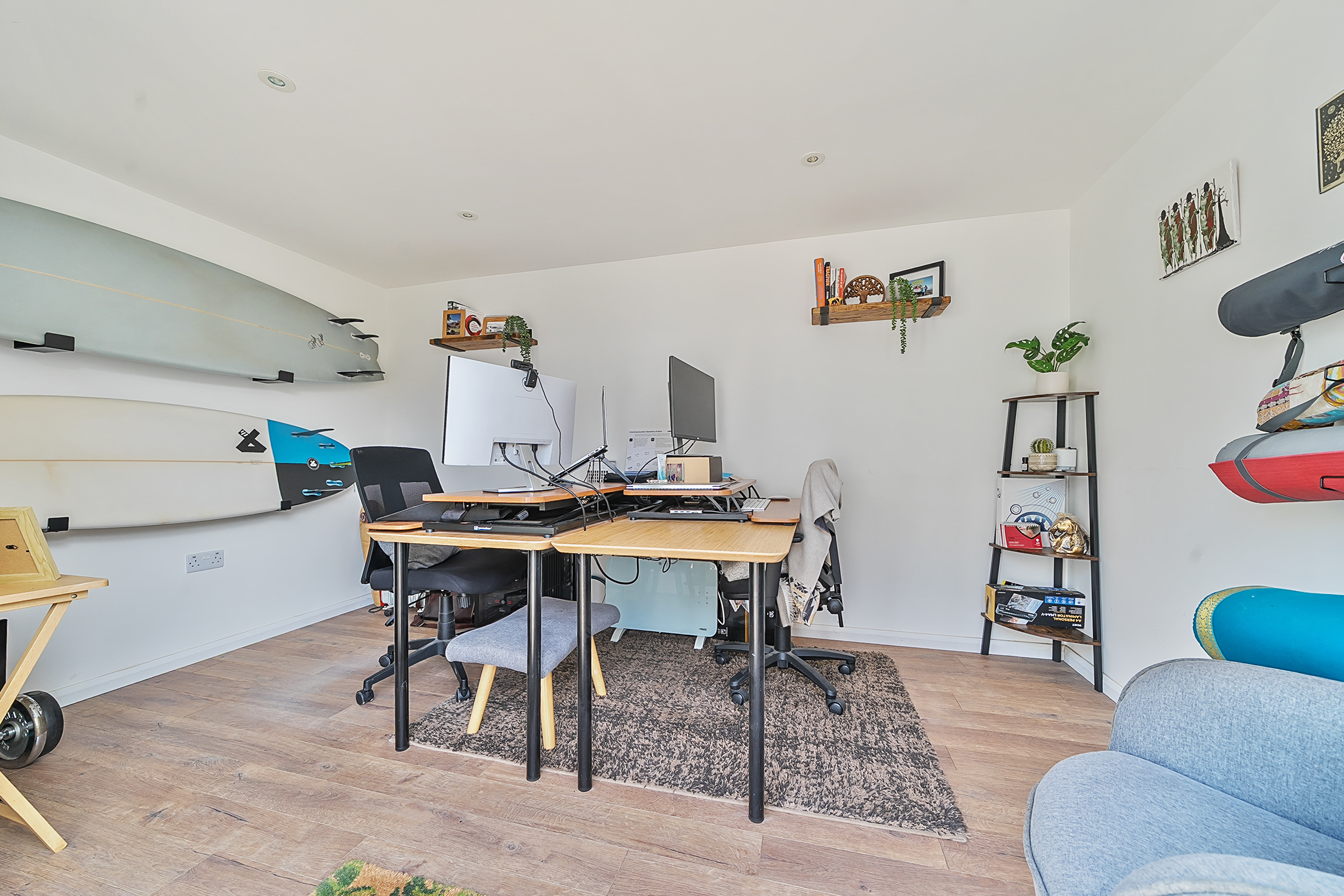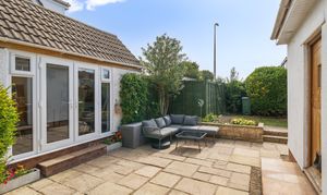 Outside – To the rear, the garden opens onto a patio area that has a charming courtyard feel—ideal for outdoor dining and relaxing. This leads to a lawn with raised beds and mature shrubs, creating a private, attractive space. The garage has been converted into a home office with French doors, while retaining storage at the front. A driveway provides off-street parking, and the front garden is lawned with a path to the entrance.