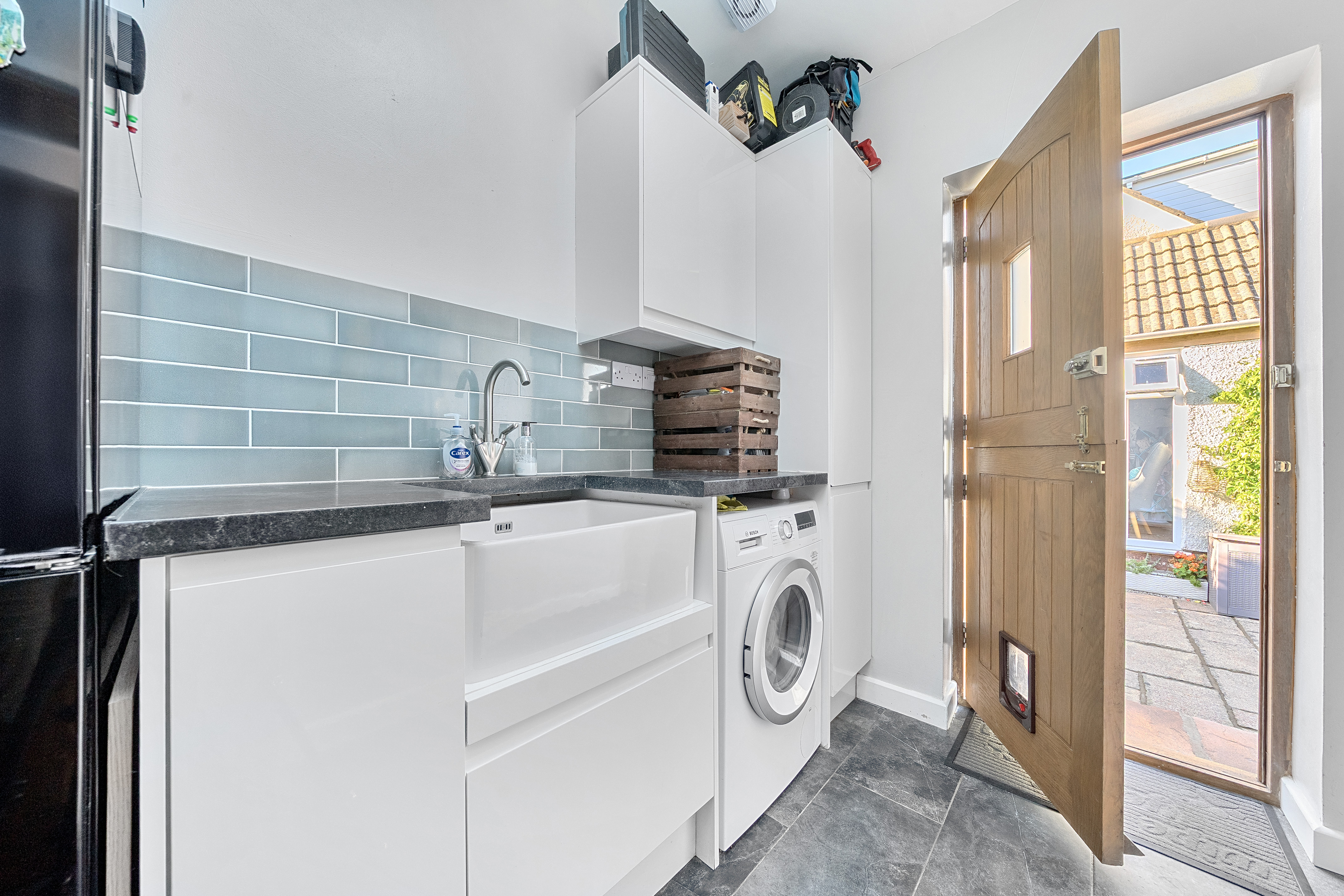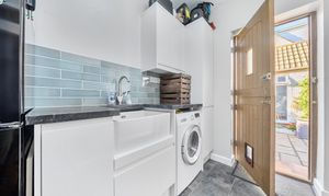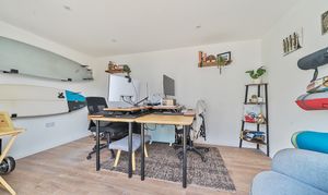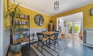 Just off the kitchen is a utility room with space for a washing machine and tumble dryer, leading to a useful downstairs shower room and access to the rear garden. The dining area flows openly into a versatile study or family room with a vaulted ceiling, Velux window, and French doors opening onto the garden—ideal for home working or as an extra reception area.