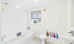 Frosted window to front, bath unit with mixer tap and shower attachment over, low level W/C, wash basin with mixer tap and tiled splashback over, with radiator, and vinyl flooring.