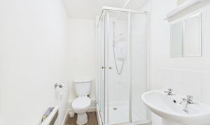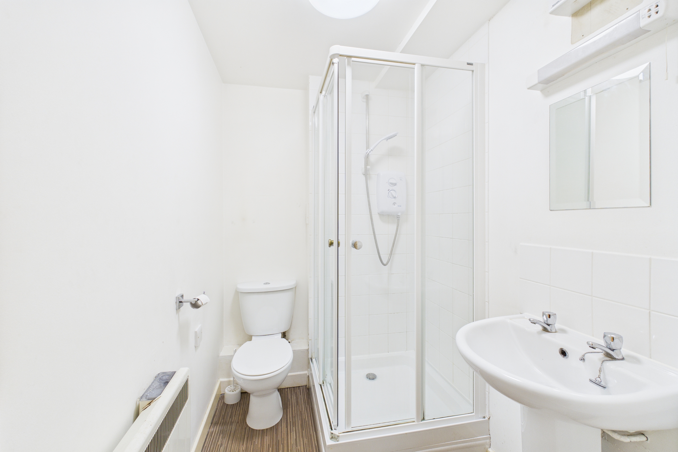 WC, Sink and shower cubicle with electric shower, shaver light, mirror, extractor fan, vinyl flooring.