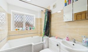 Frosted window to front, bath with mixer tap and shower attachment over, low level W/C, wash basin with mixer tap over, with partial wall tiling, radiator, and tiled flooring.