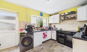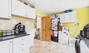 Window to rear, matching wall and base units with worktop over, inset 1.5 bowl sink unit with mixer tap over, tiled splash backs, space for electric cooker, washing machine, dishwasher, tumble dryer, and fridge / freezer, with door to under stairs storage cupboard, radiator, wood effect vinyl flooring, and further door to rear garden.