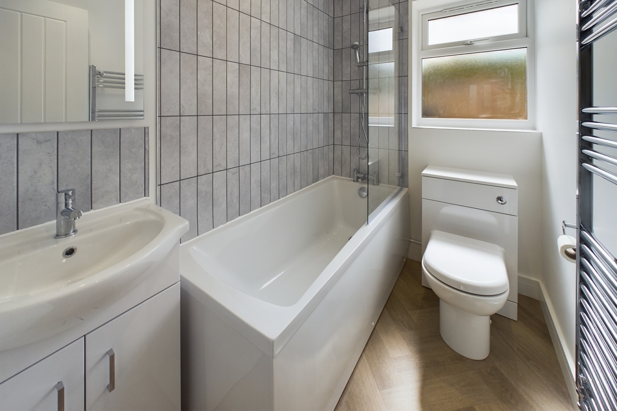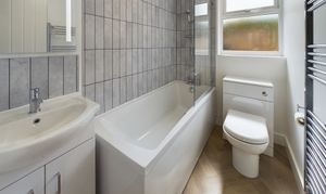 Suite comprising; low level wc, wash hand basin with cupboard under, panel enclosed bath with mixer taps and separate shower unit, glazed shower screen, recessed spotlight, heated towel radiator, mirror with light, wooden effect flooring.