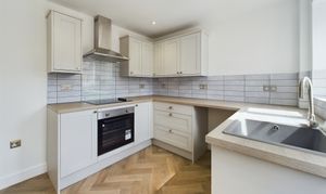 Fitted with a range of base and wall mounted units, wooden effect work surface with composite single drainer sink unit and mixer taps, tile effect splash backs, space for upright fridge freezer and washing machine, built in oven, hob and extract hood over, recessed spot lights, radiator, double glazed window to rear, door to the garden.