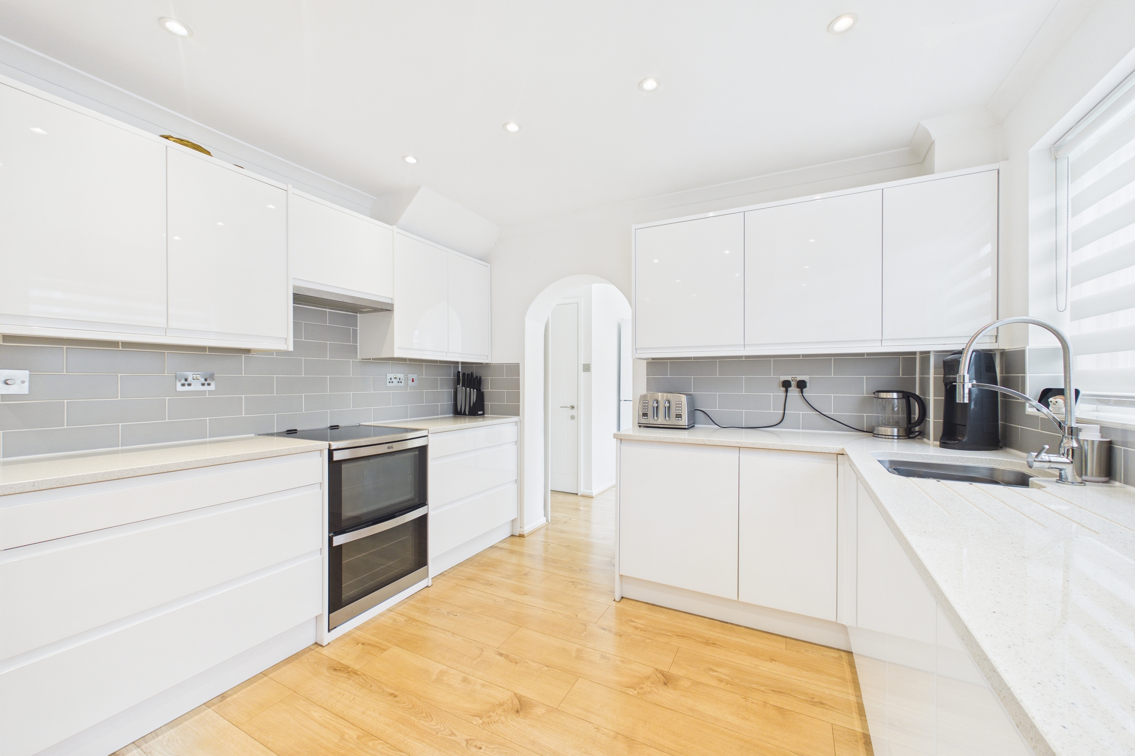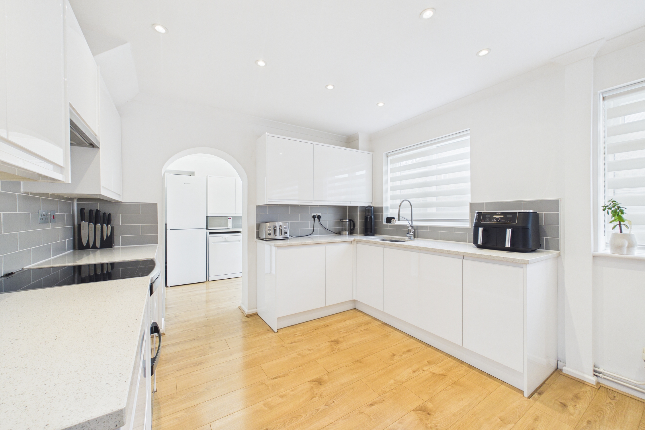 Window to rear, wall units with quarts worktop, space for washing machine, dishwasher, tumble dryer and fridge freezer, laminate flooring, wall mounted gas combination boiler located within wall cupboard, door to downstairs WC, garage and rear garden.