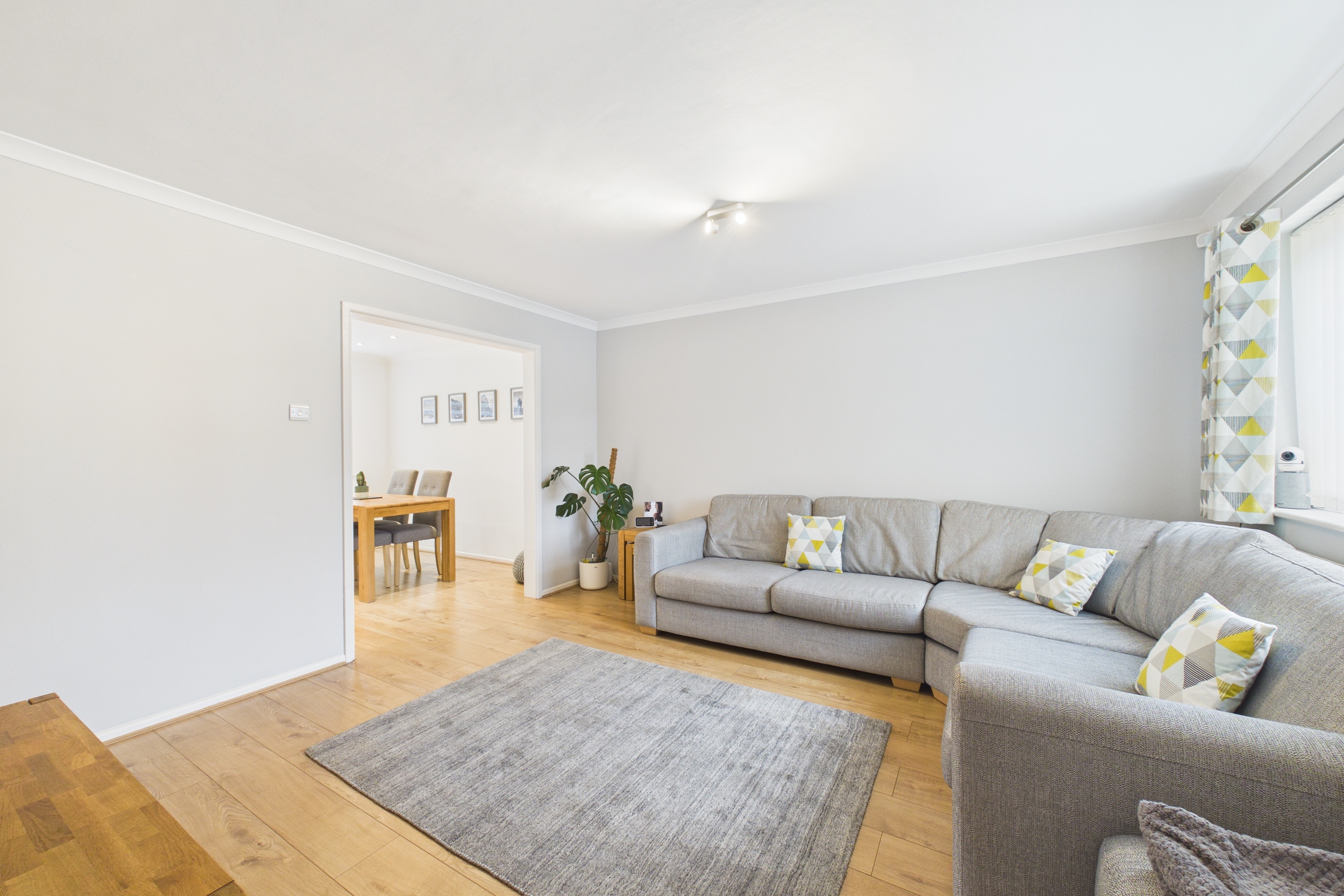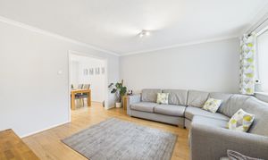 Window to front, radiator, laminate flooring, door to under stairs storage cupboard, stairs to first floor landing and opening to kitchen/diner.
