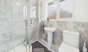 Window to rear, large shower cubicle, low-level WC, wash basin, part wall tiling, extractor fan, heated towel rail and toothbrush charger.