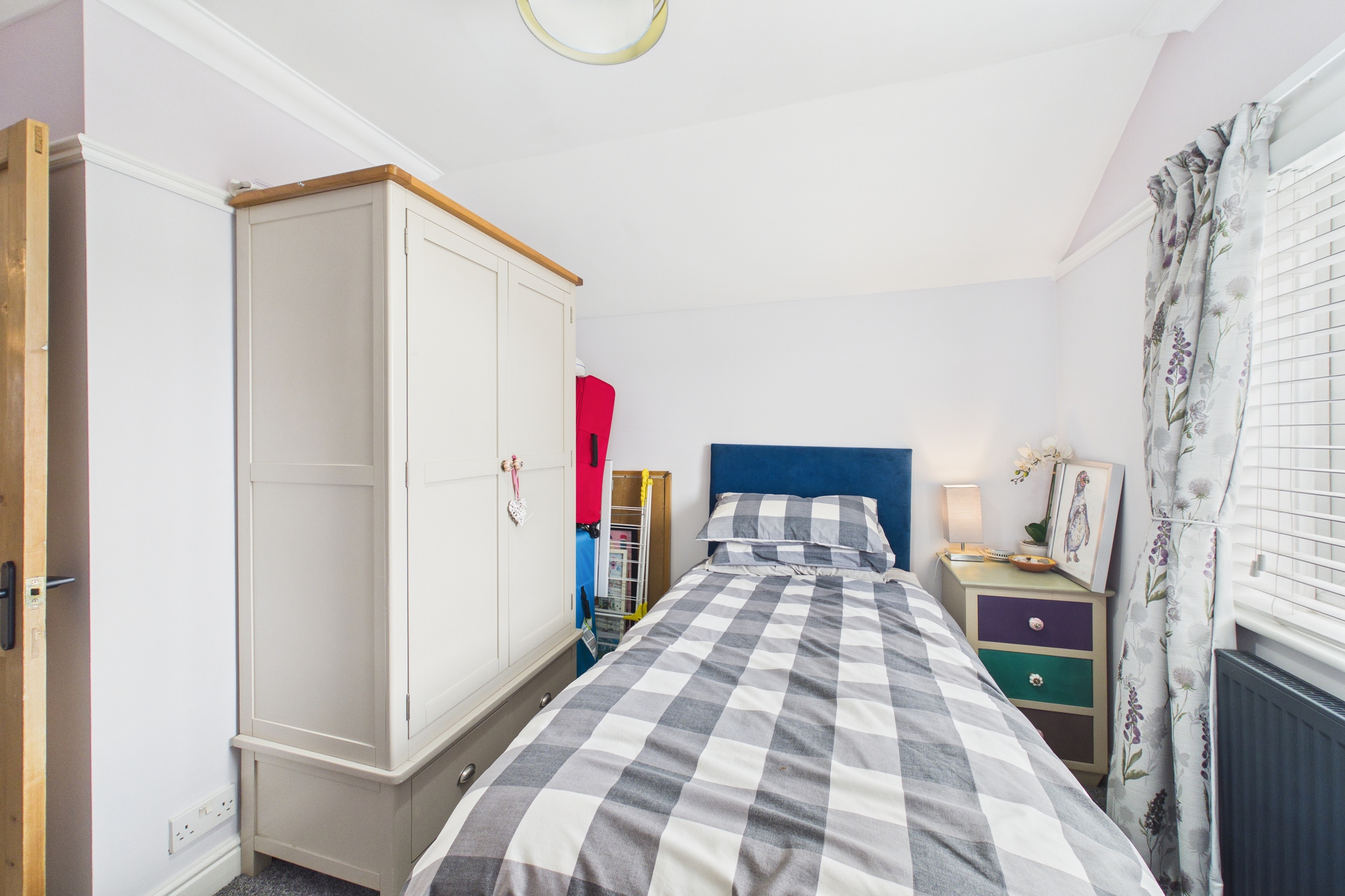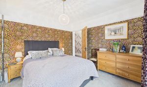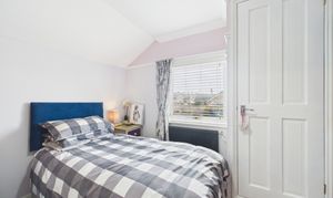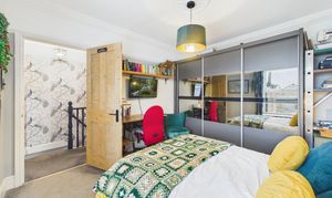 Doors to all bedrooms, family bathroom, and balcony, with radiator, carpet flooring, and access to loft via two ceiling hatches.