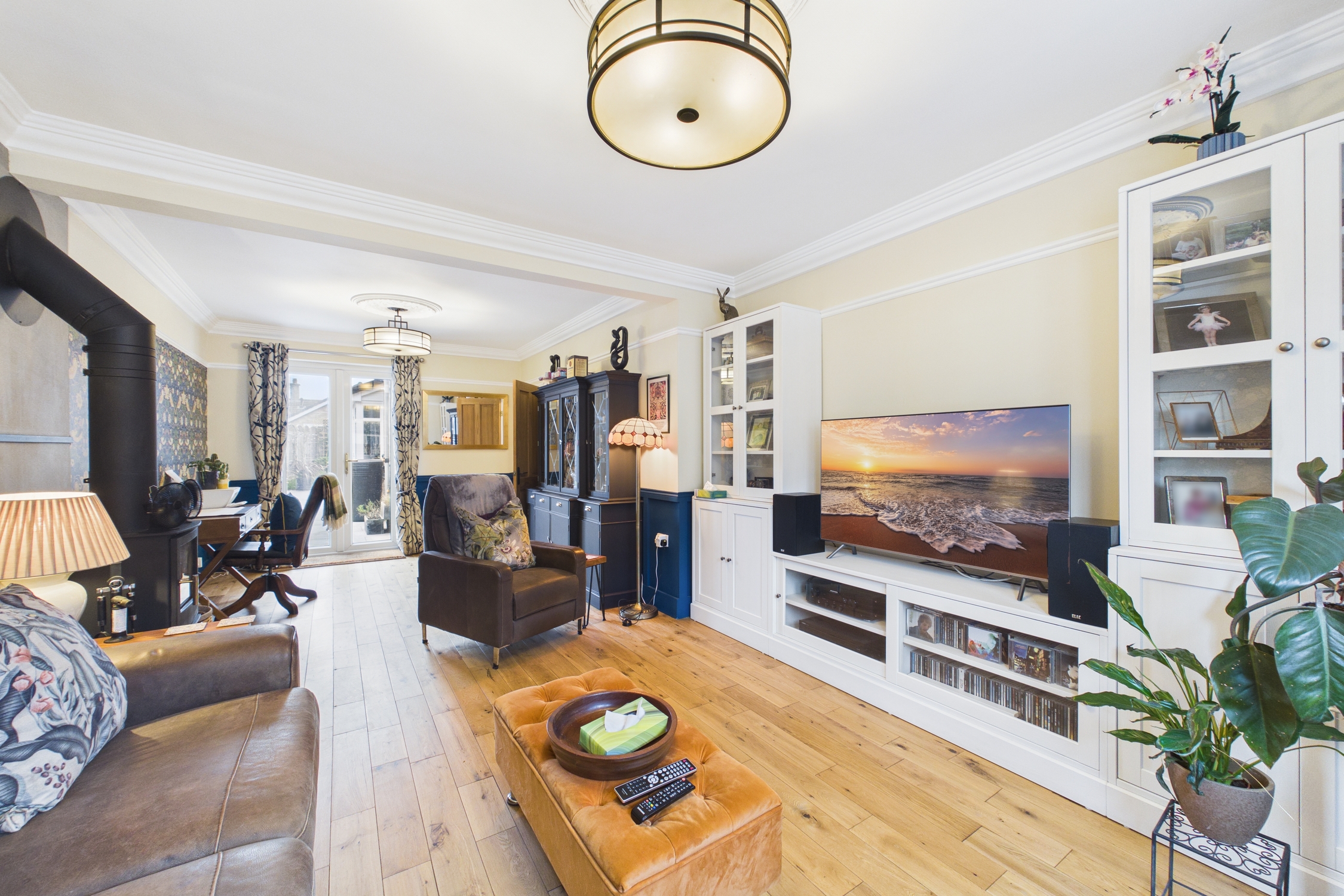 Bay window to front, feature log burner with stone plinth, built-in storage unit, with two radiators, wood effect flooring, and French doors to the rear garden.