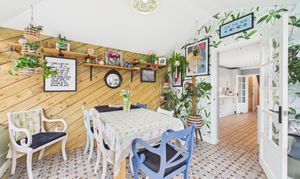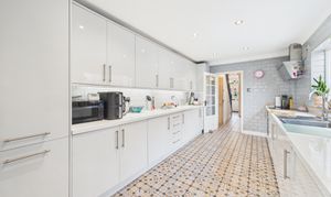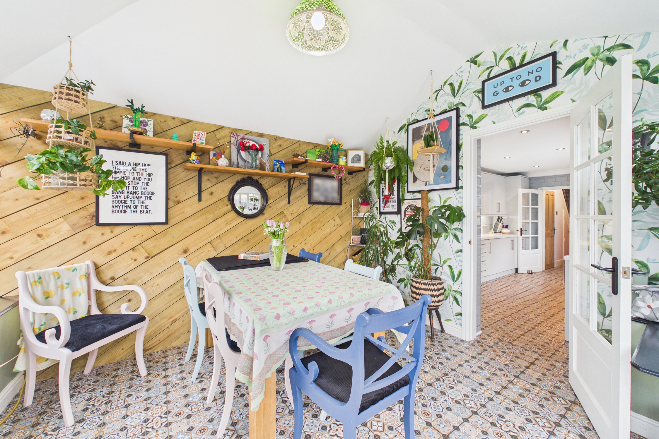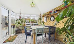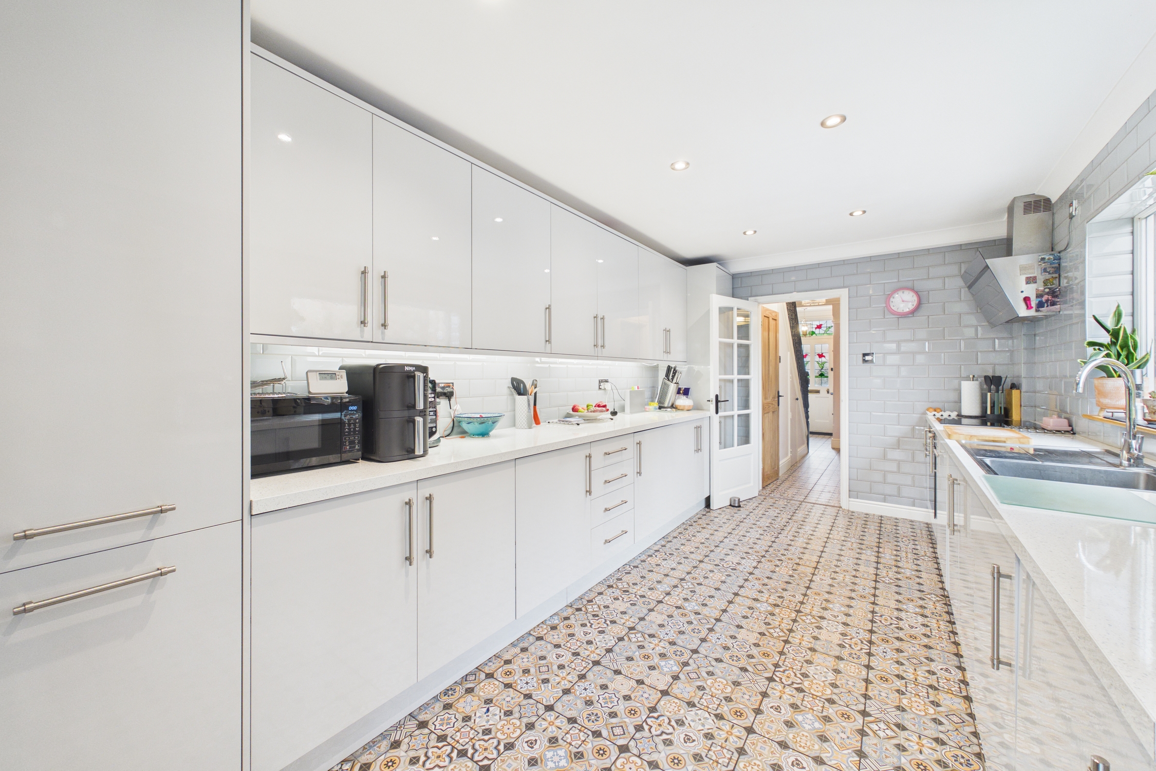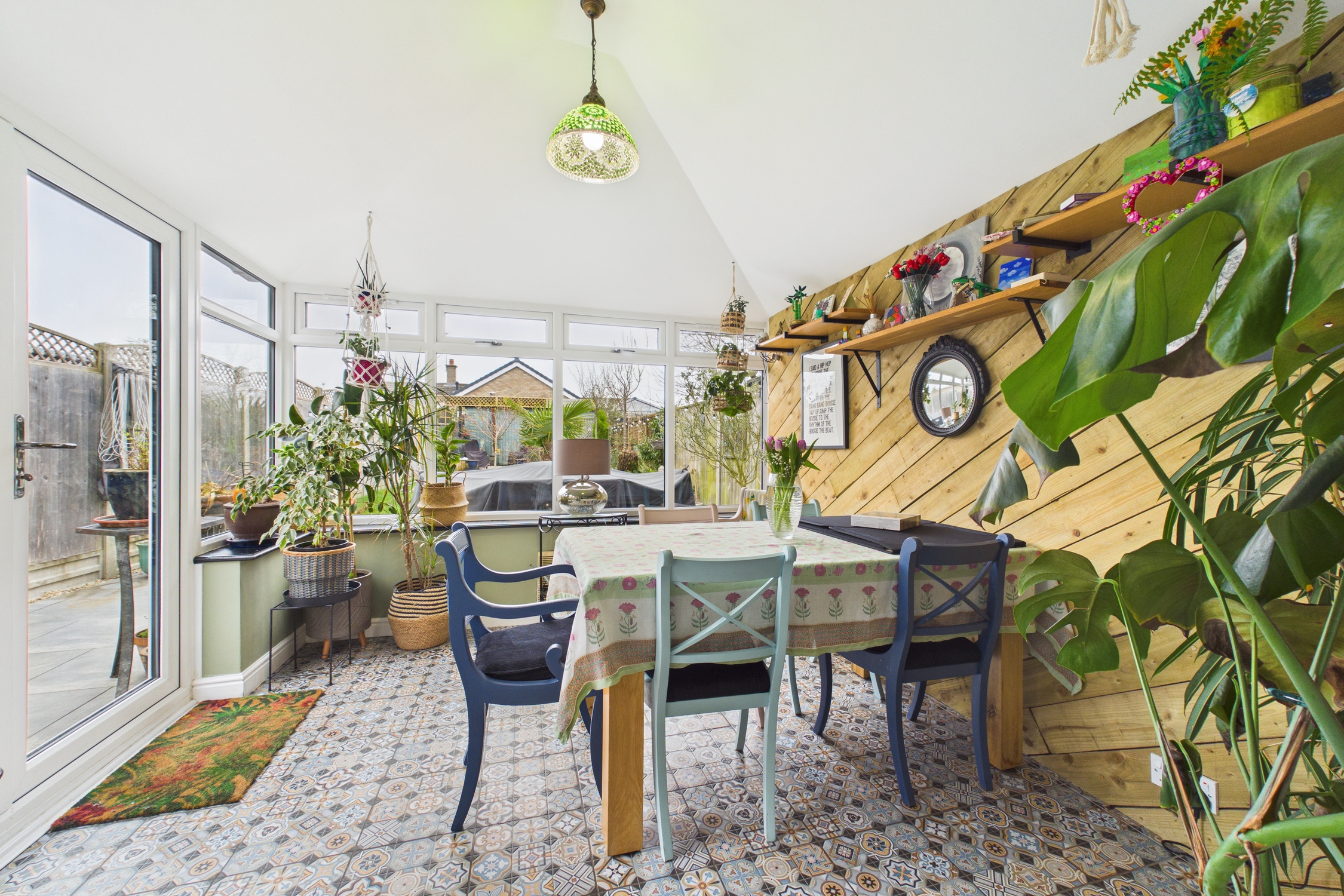 Windows to rear and side, with tiled flooring, and French doors to the rear garden.