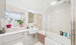 Frosted window to side, bath with mixer tap and separate mixer tap shower over, low level W/C, wash basin with mixer tap over and vanity storage beneath, with full wall tiling, and tiled flooring.