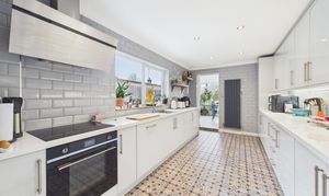 Window to side, matching wall and base units with worktop over, inset 1 bowl sink unit with mixer tap over, tiled splashbacks, integrated electric oven and hob with cooker hood over, fridge, freezer, washing machine, tumble dryer, and dishwasher, with upright radiator, tiled flooring, spotlighting, and door to dining room.