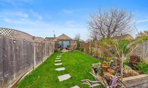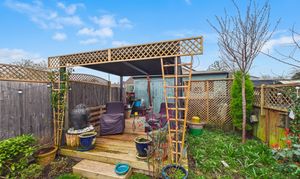Mainly laid to lawn, with patio area to the immediate rear of the property, raised decking area, space for a large workshop / shed, and side access gate to the front.