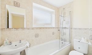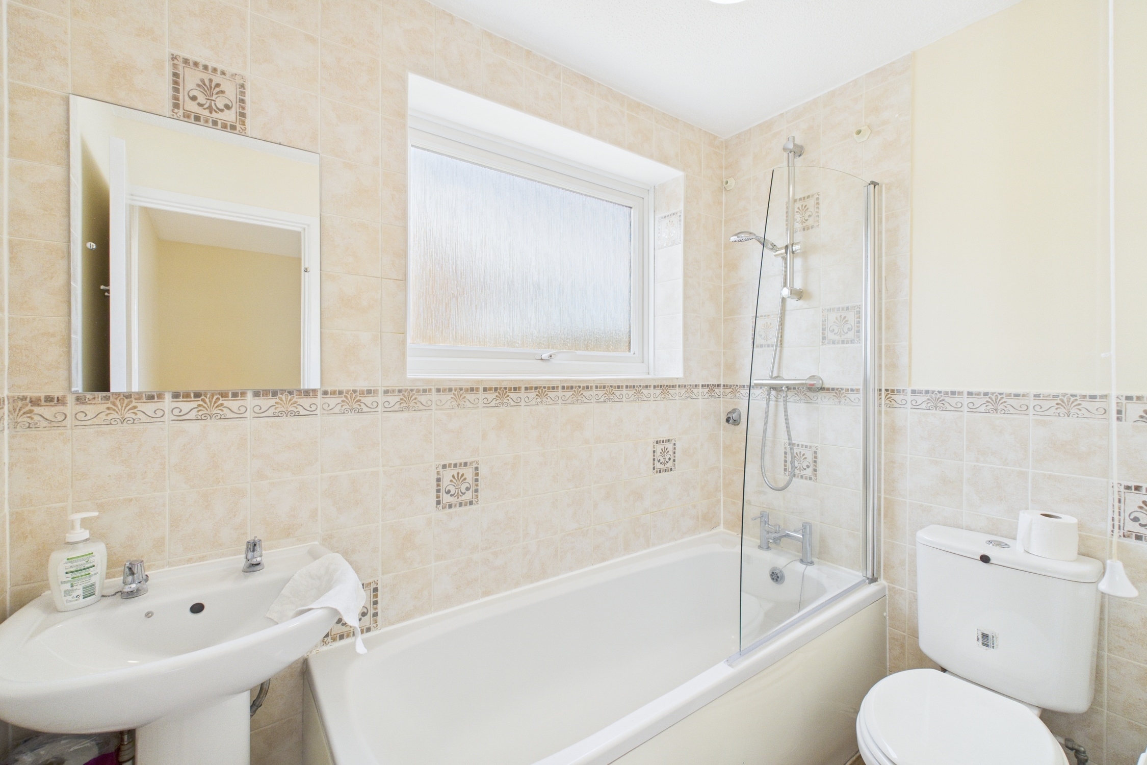 With white 3 piece suite comprising W.C, wash hand basin and paneled bath with shower over, glass shower screen, frosted double glazed window to side, vinyl flooring