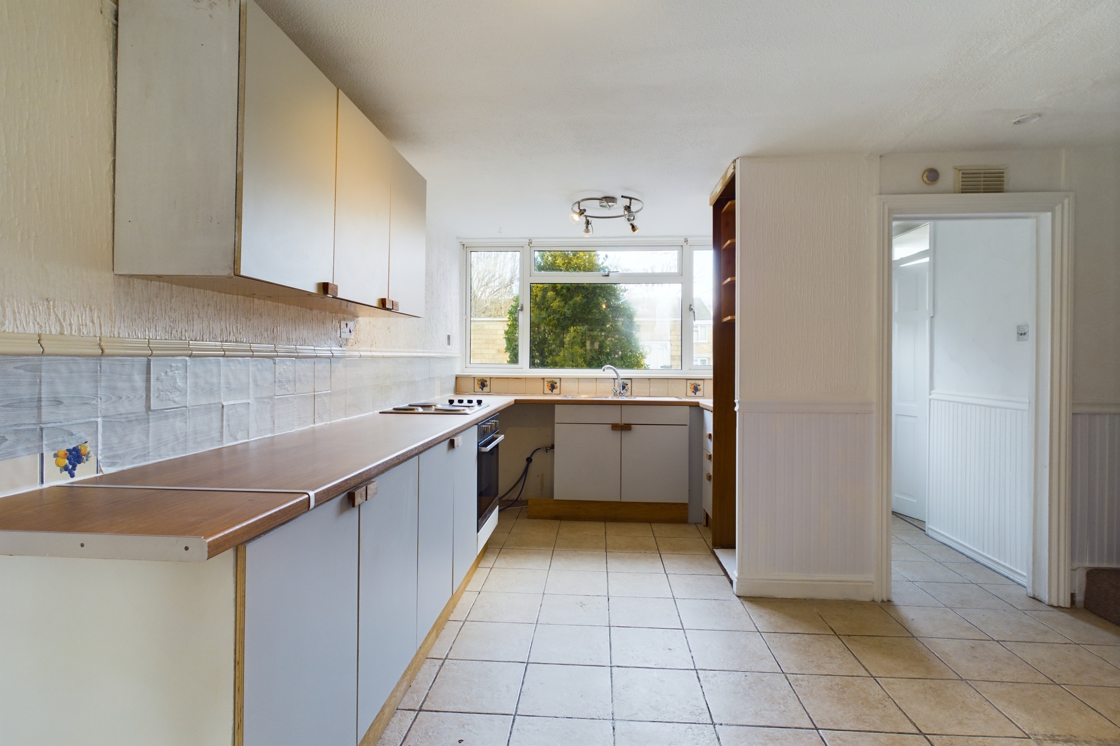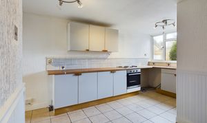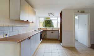 With a fitted range of wall and base units with work surface over, inset sink with mixer tap, tiled splashback, built in oven, electric hob, space and plumbing for washing machine, space for fridge freezer, tiled flooring. Stairs leading to first floor