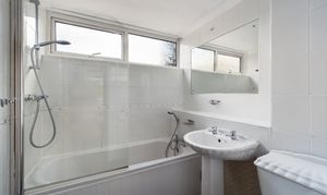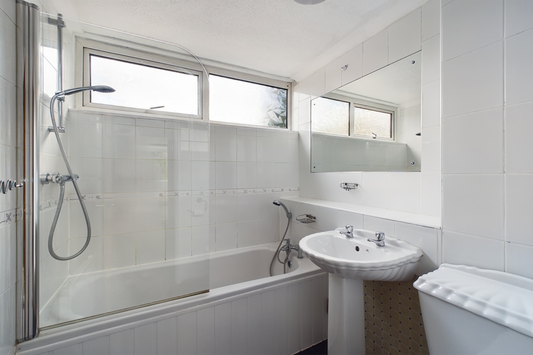 Three piece white suite comprising of wash hand basin, W.C, Panel bath with shower over, part tiled walls, tiled flooring, Frosted window to front