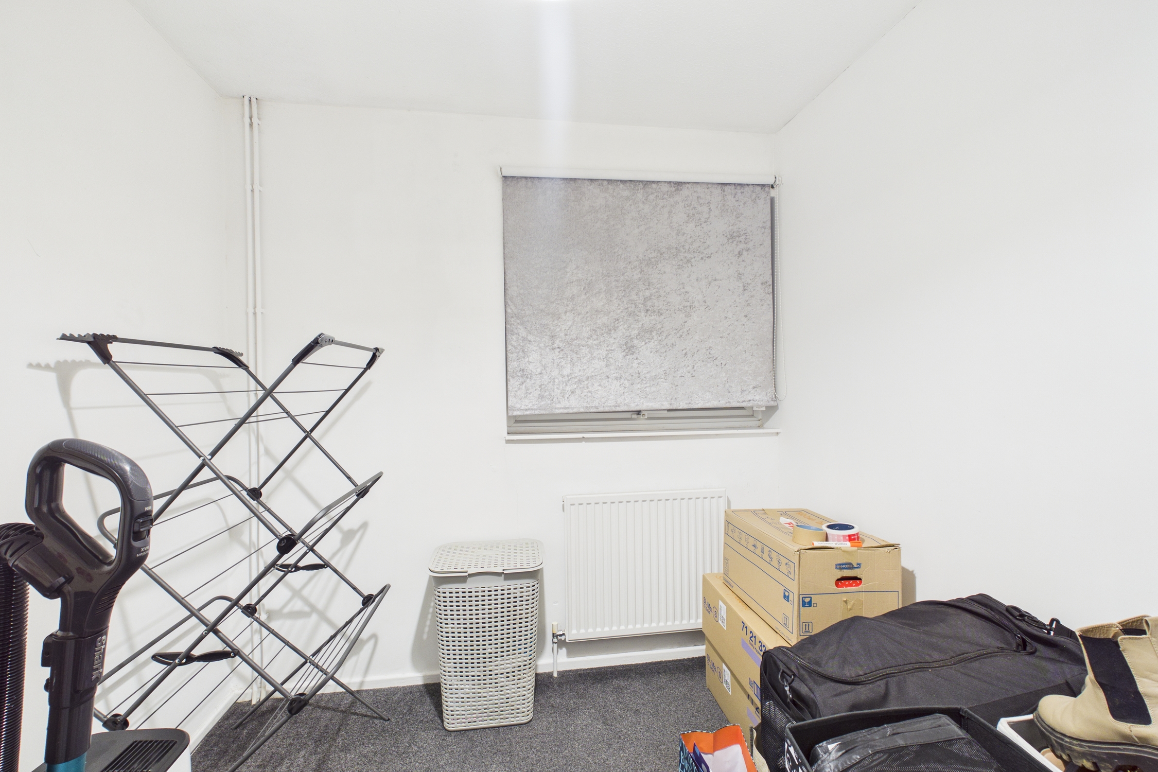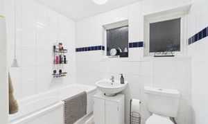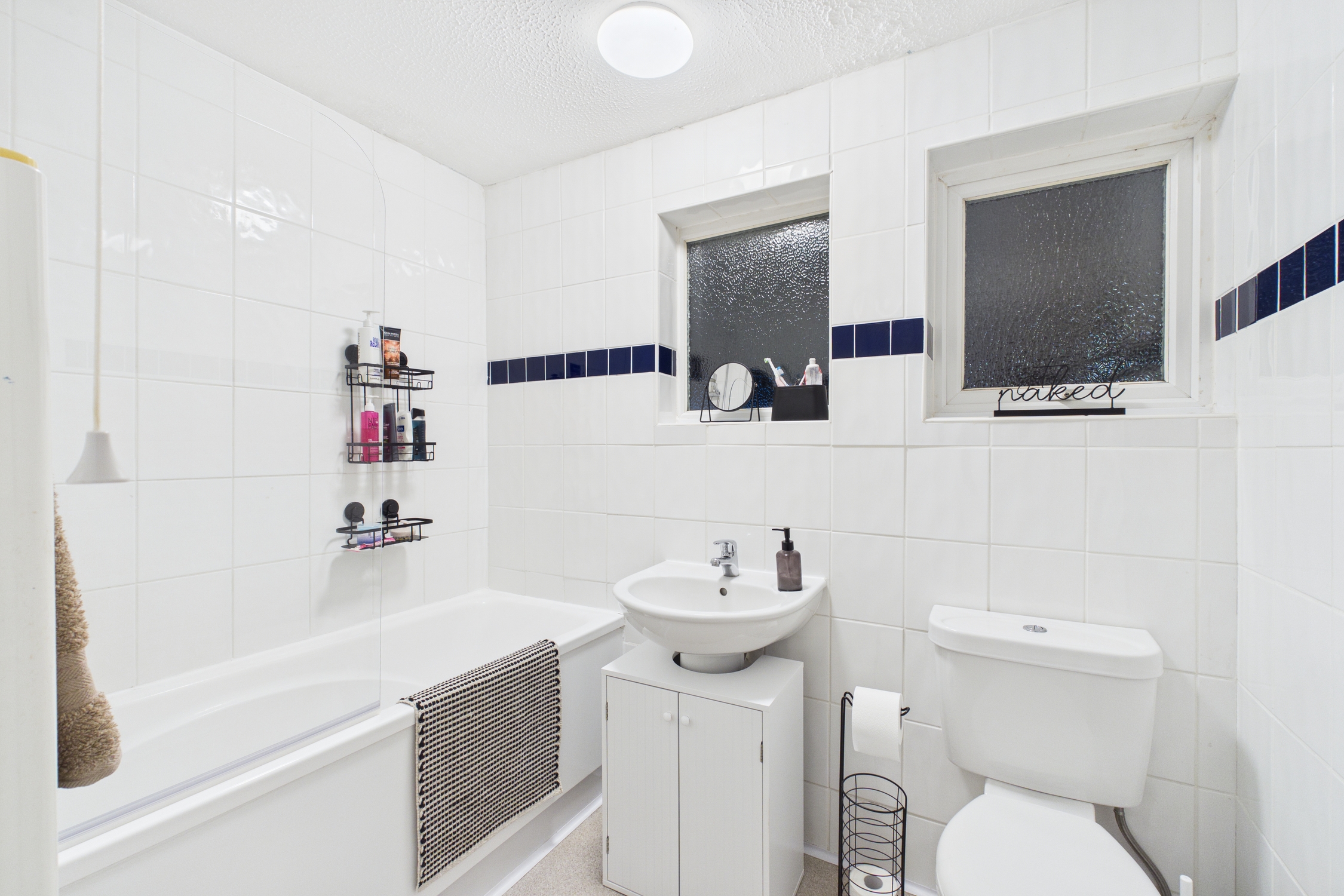 Two frosted double glazed windows to rear, white suite comprising of panelled bath with shower over and glass shower screen, pedestal wash hand basin, W.C, tiled walls, vinyl flooring