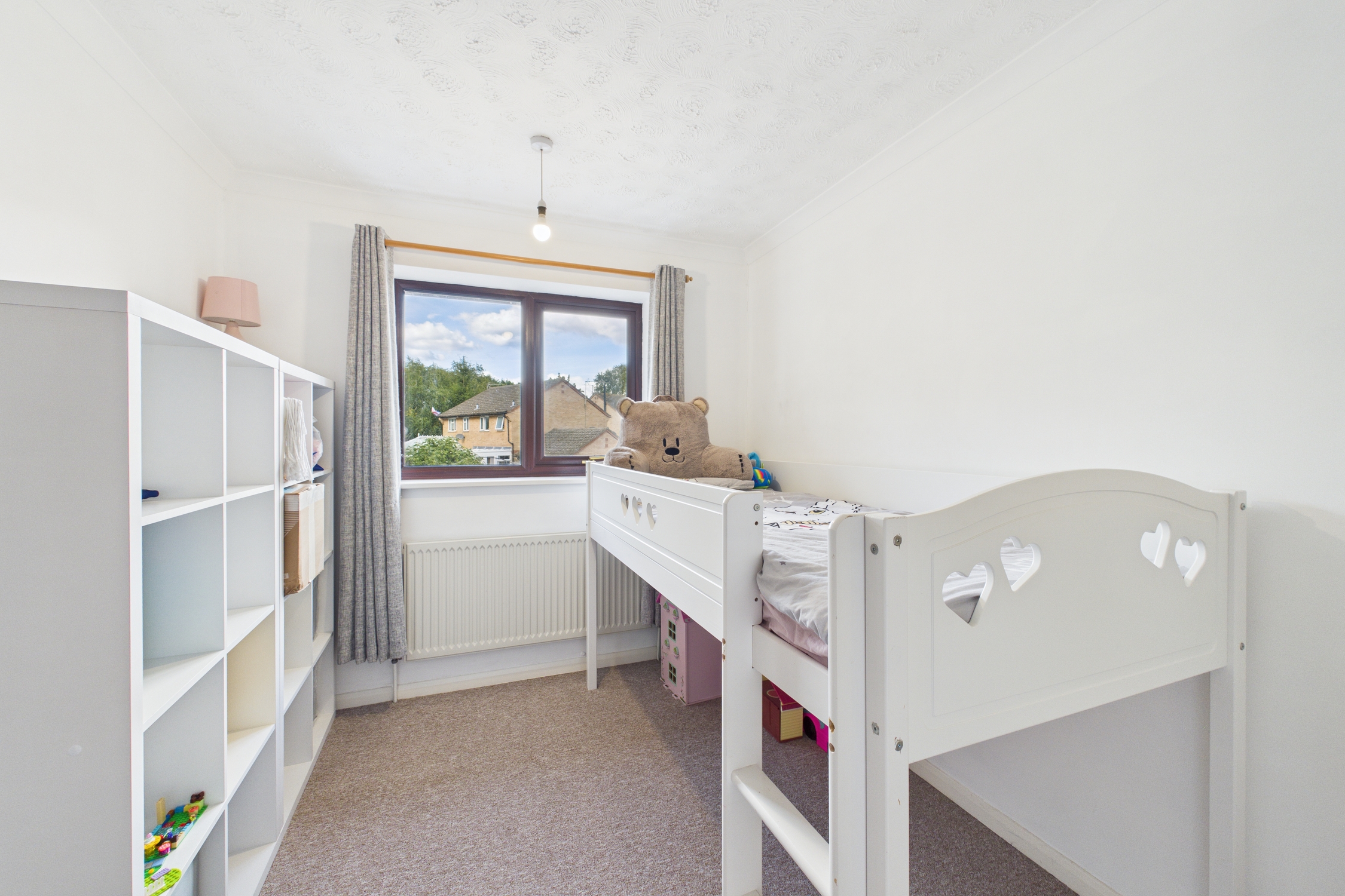 Doors to all bedrooms and shower room, with carpet flooring, and access to loft via ceiling hatch.